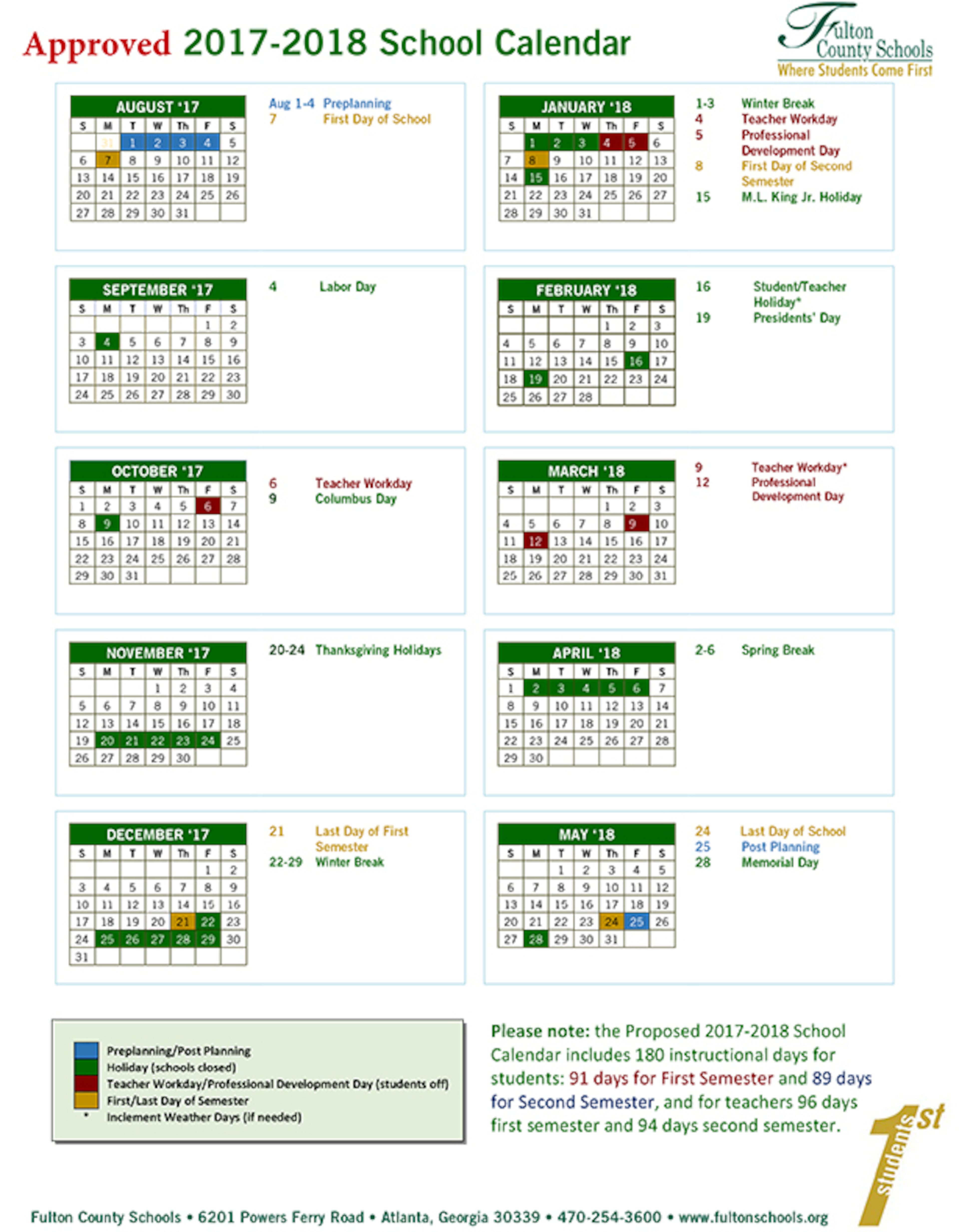 Fulton County School System’s 2017-18 Calendar
