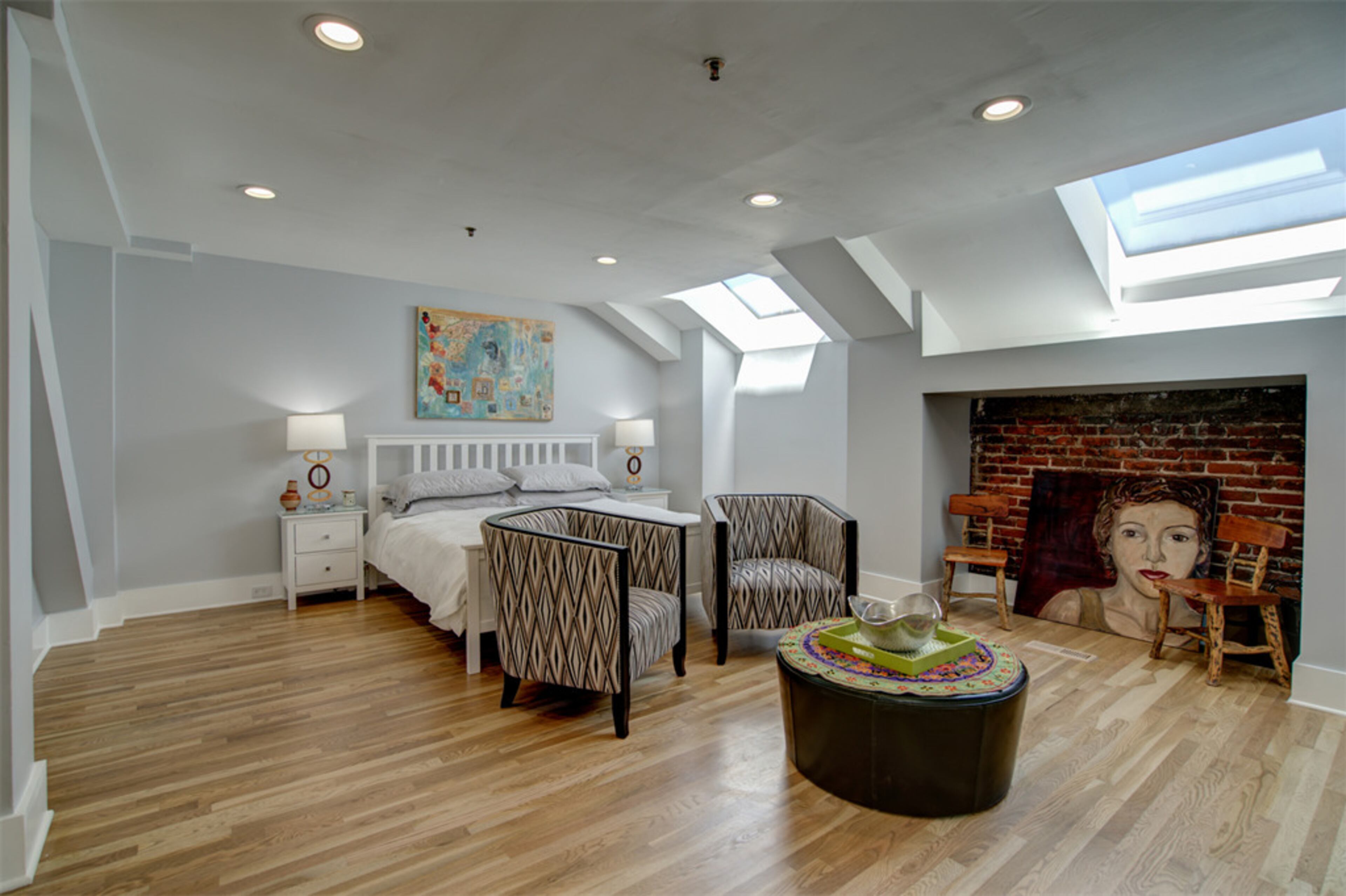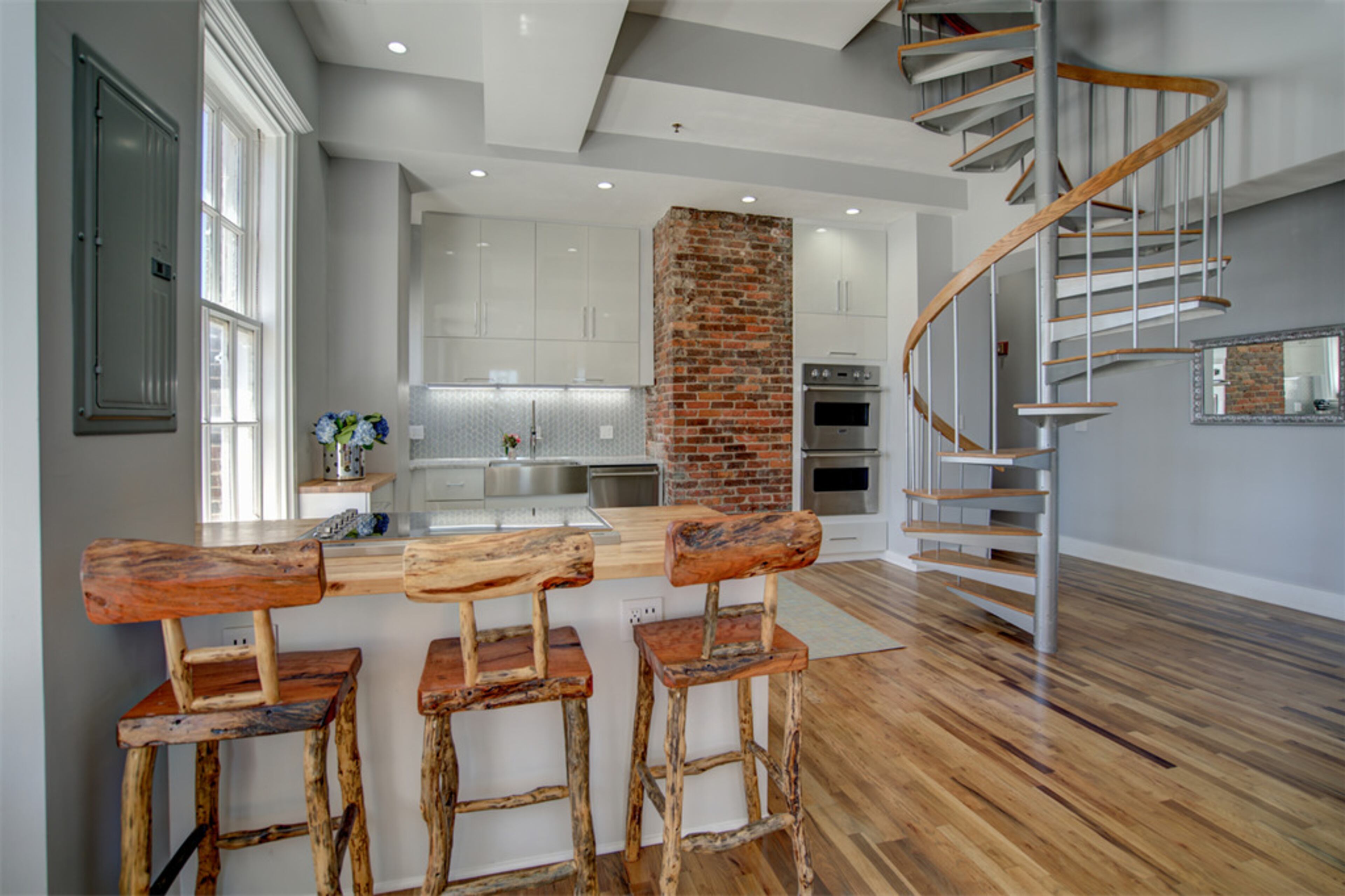 A spiral staircase and original 1924 exposed brick can be seen in the kitchen. And in the living room, an exposed concrete pillar shows the raw structure of the building.