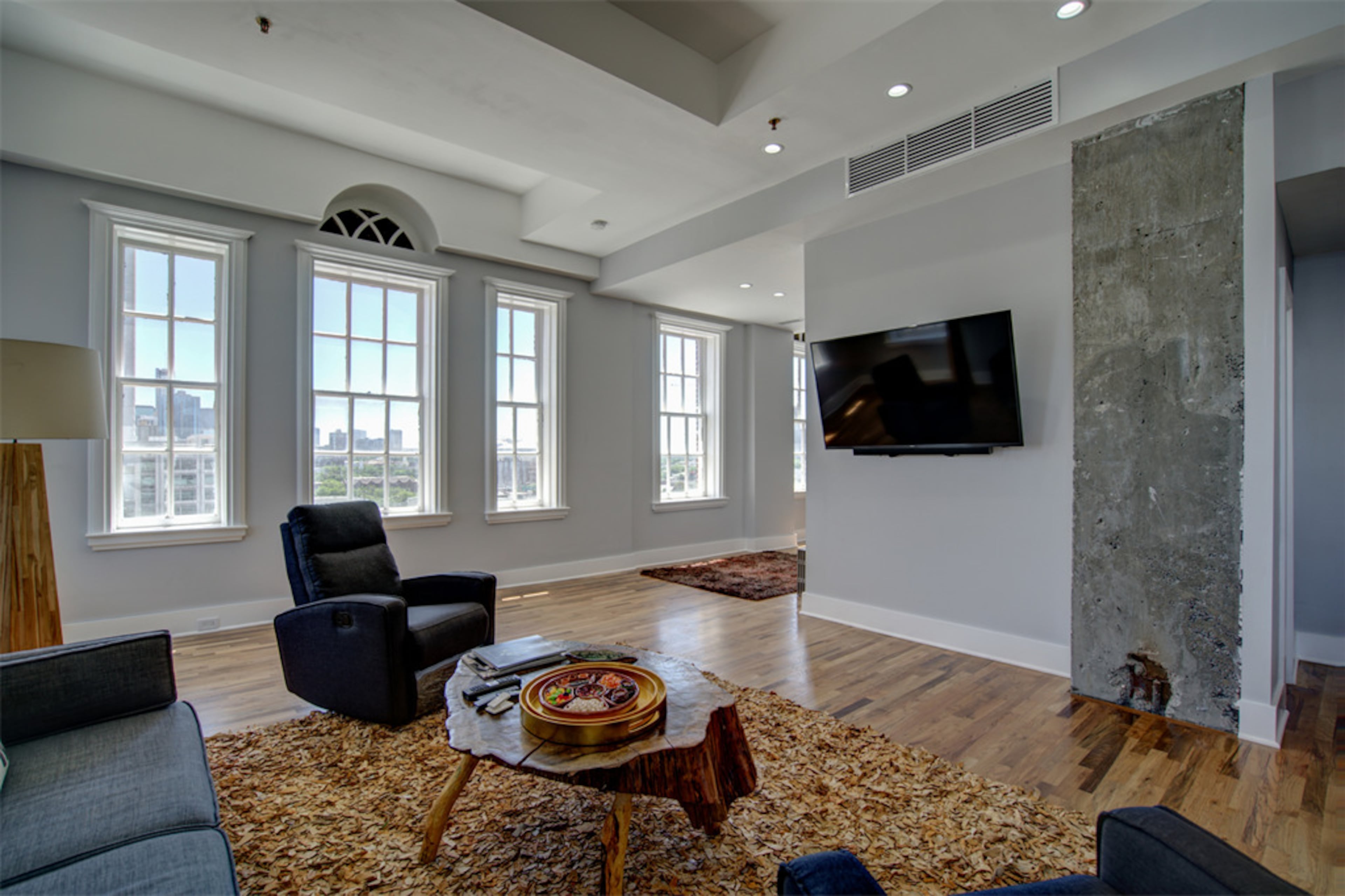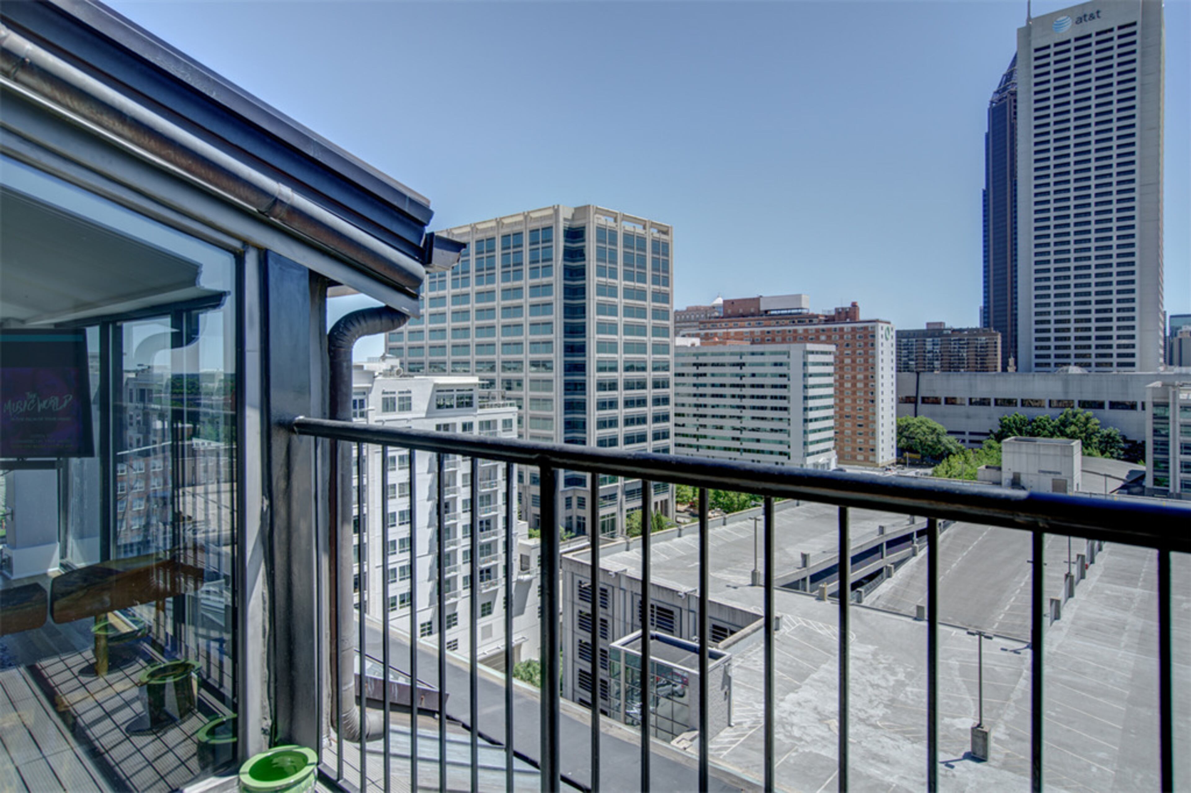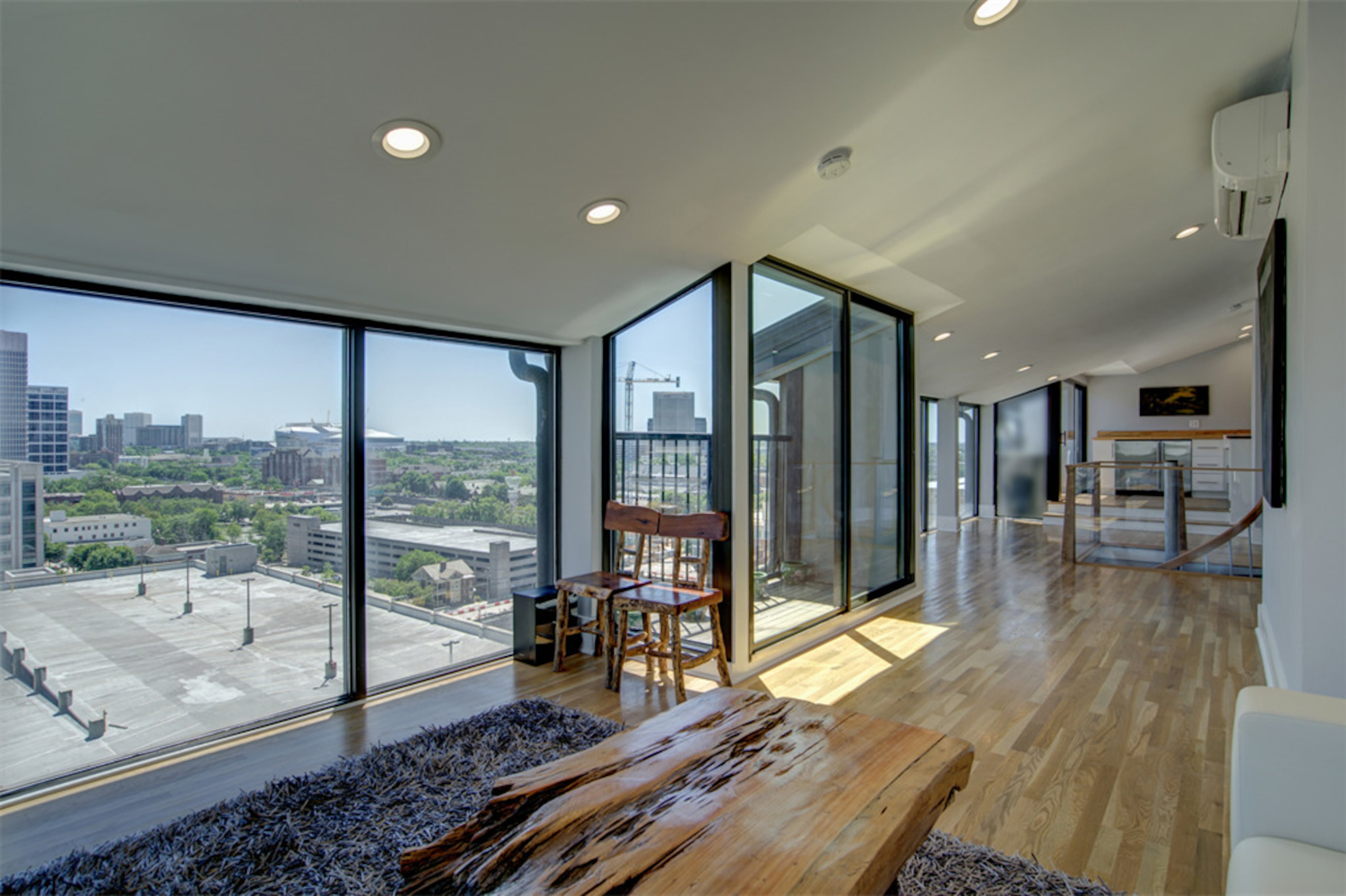 Loacted near Georgia Tech, the 10th floor penthouse with floor-to-ceiling windows on the upper level has a 270-degree view that overlooks the Mercedes-Benz Stadium, the CNN Center and Stone Mountain.