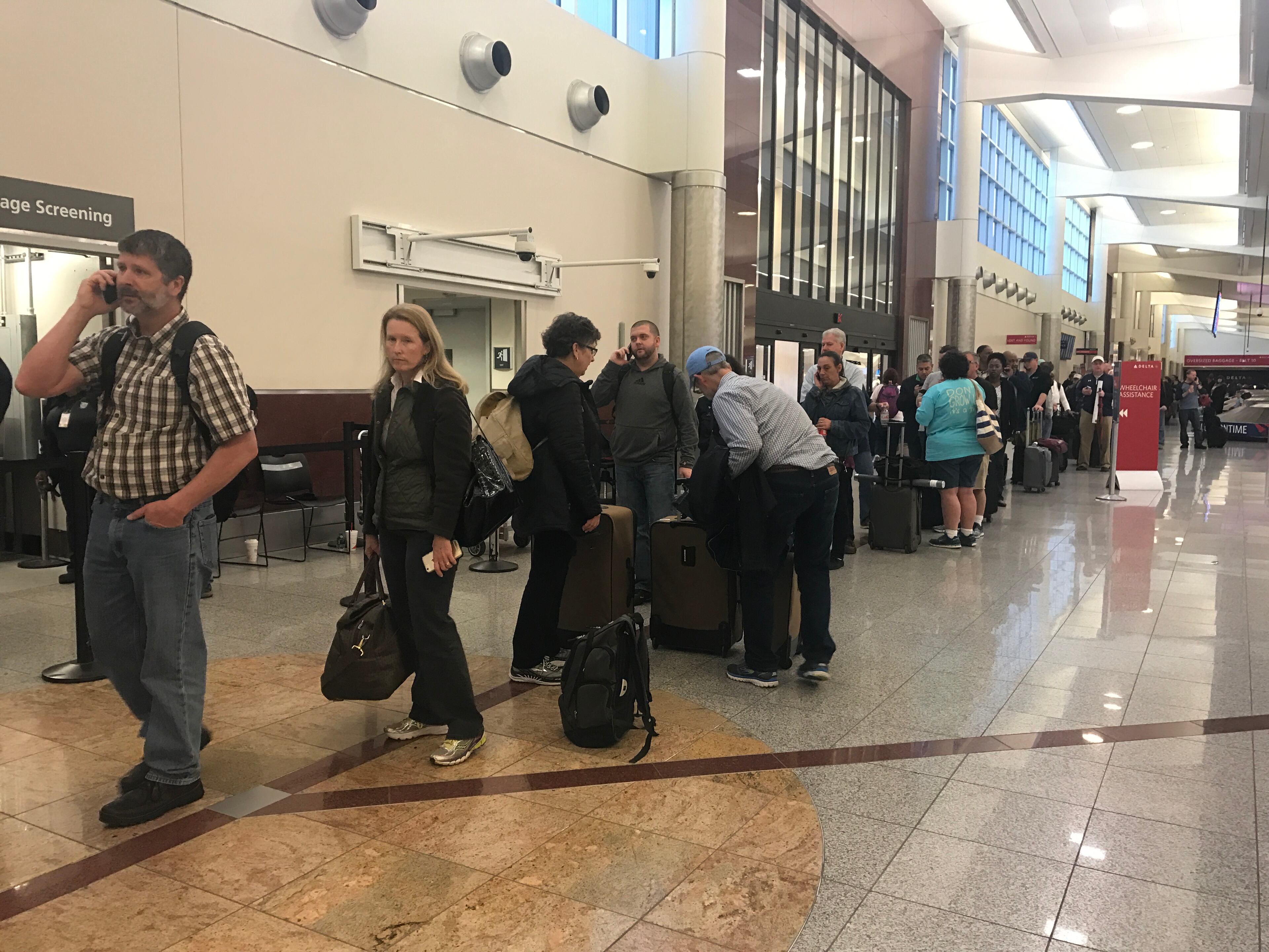 Long lines for rebooking, baggage assistance and check-in at Delta counters filled the terminal Friday morning, two days after the thunderstorm that triggered the flight disruptions.