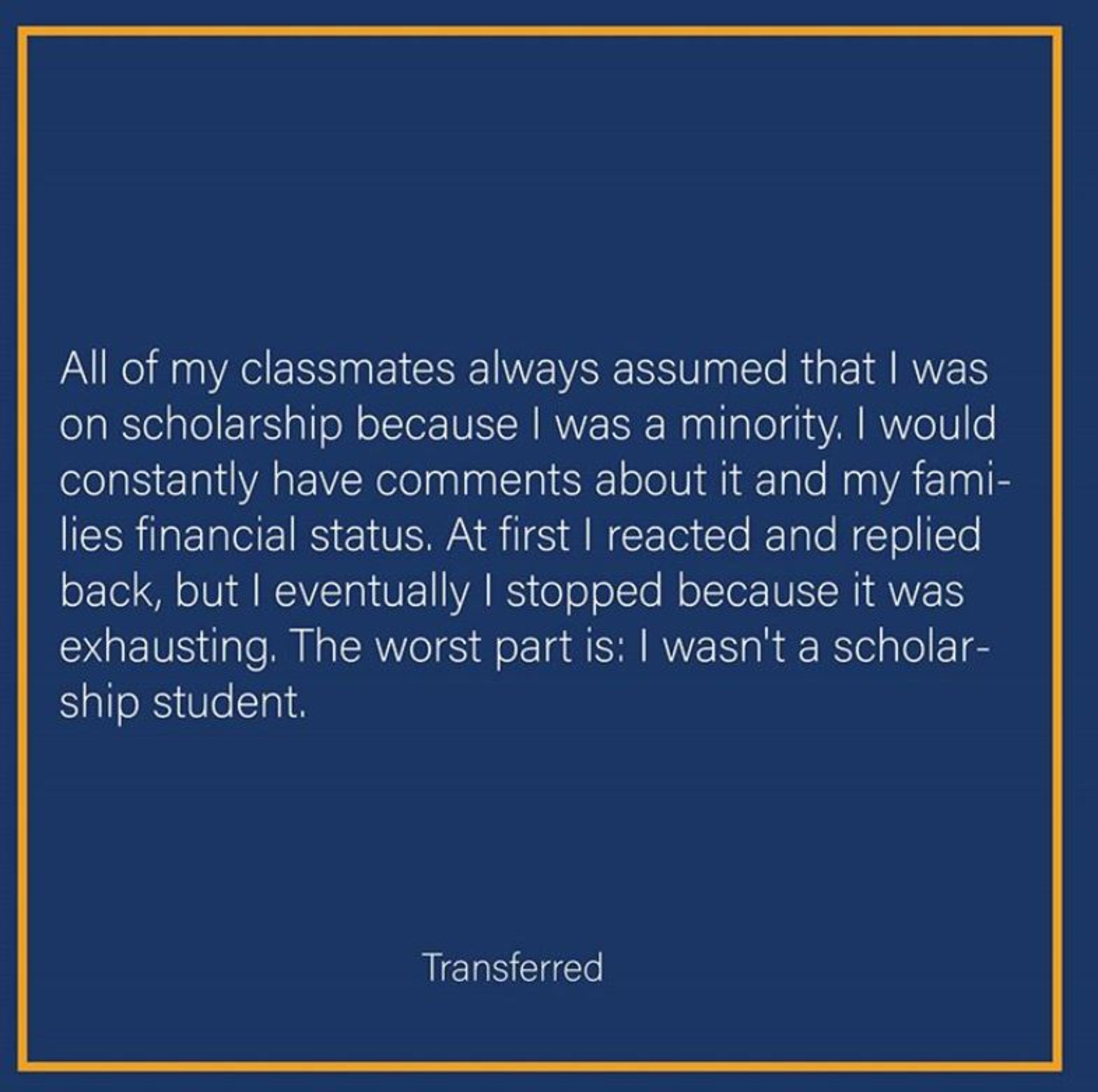 -I busted my ass in high school and got into many top colleges. Comments made by my classmates that I only got in because I was black stayed with me for years.