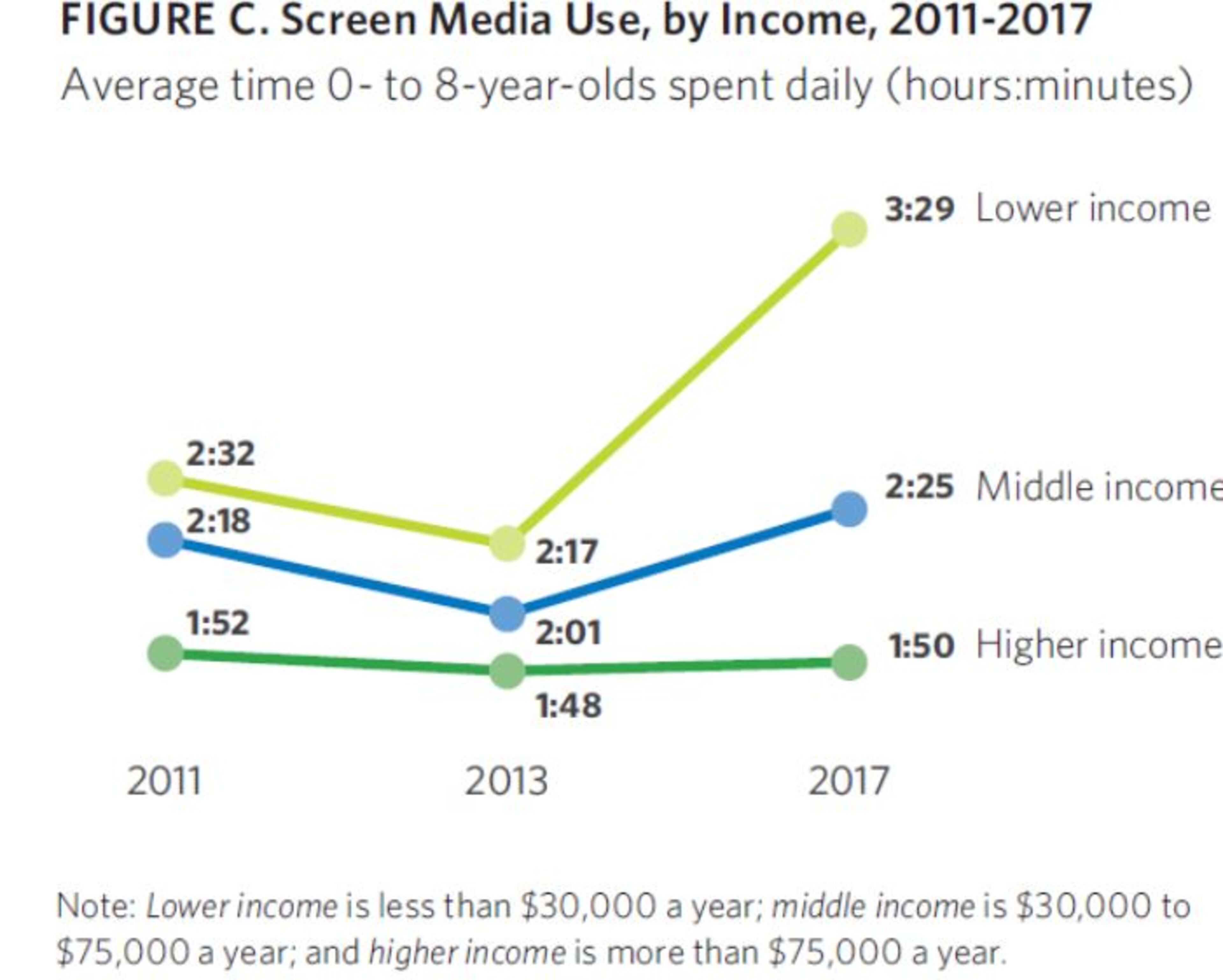 However, among low-income children, time given over to screens soared, from 2 hours and 32 minutes in 2011 to 3 hours and 29 minutes in 2017.