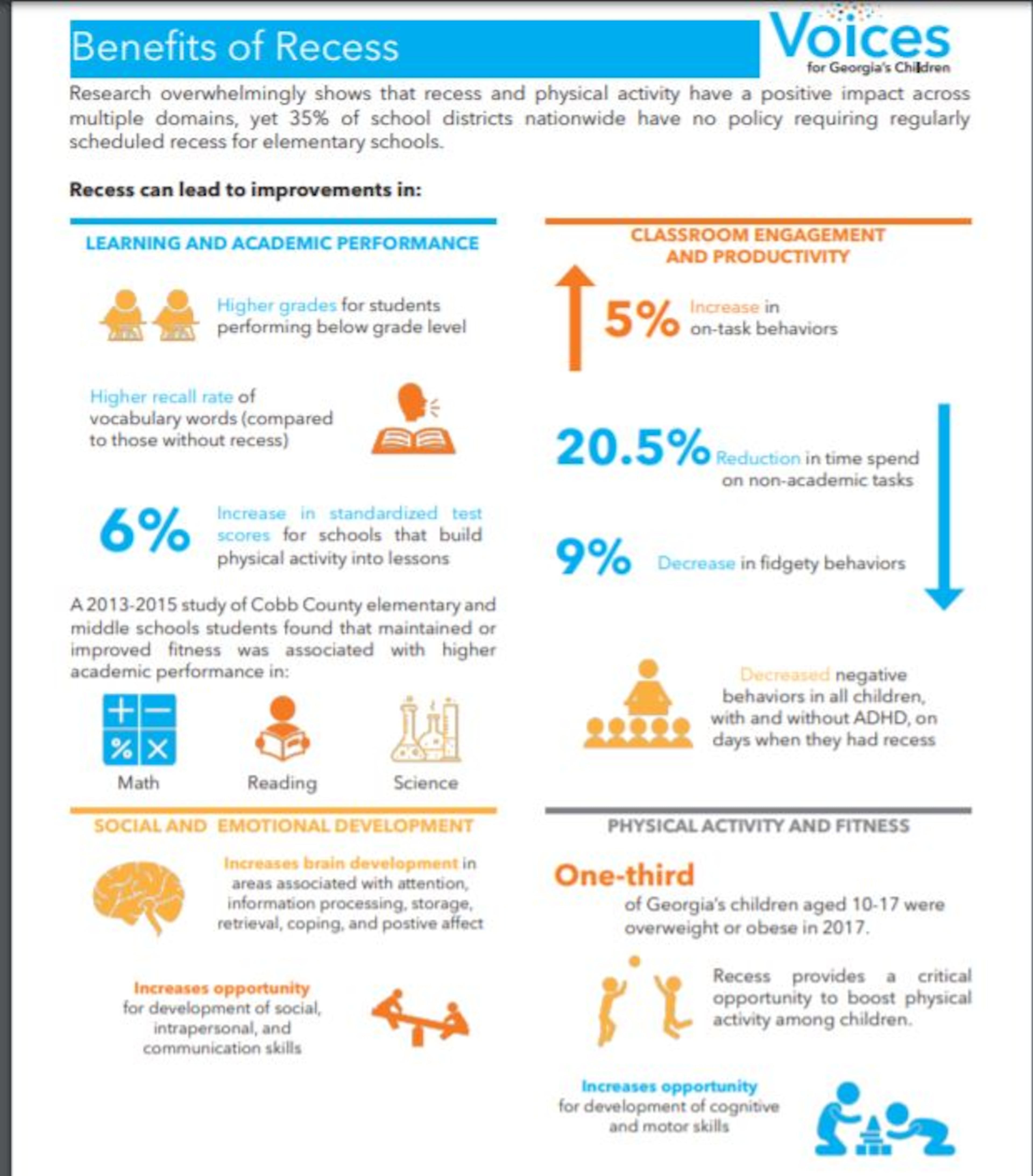 There is no federal requirement for recess as it’s viewed as a state matter. Five states mandate recess, while at least seven states require daily physical activity for elementary schools. In every case, legislators in those states expressed fears over the increasing sedentary lifestyles of children. Georgia has the 18th highest obesity rate for youth ages 10 to 17
