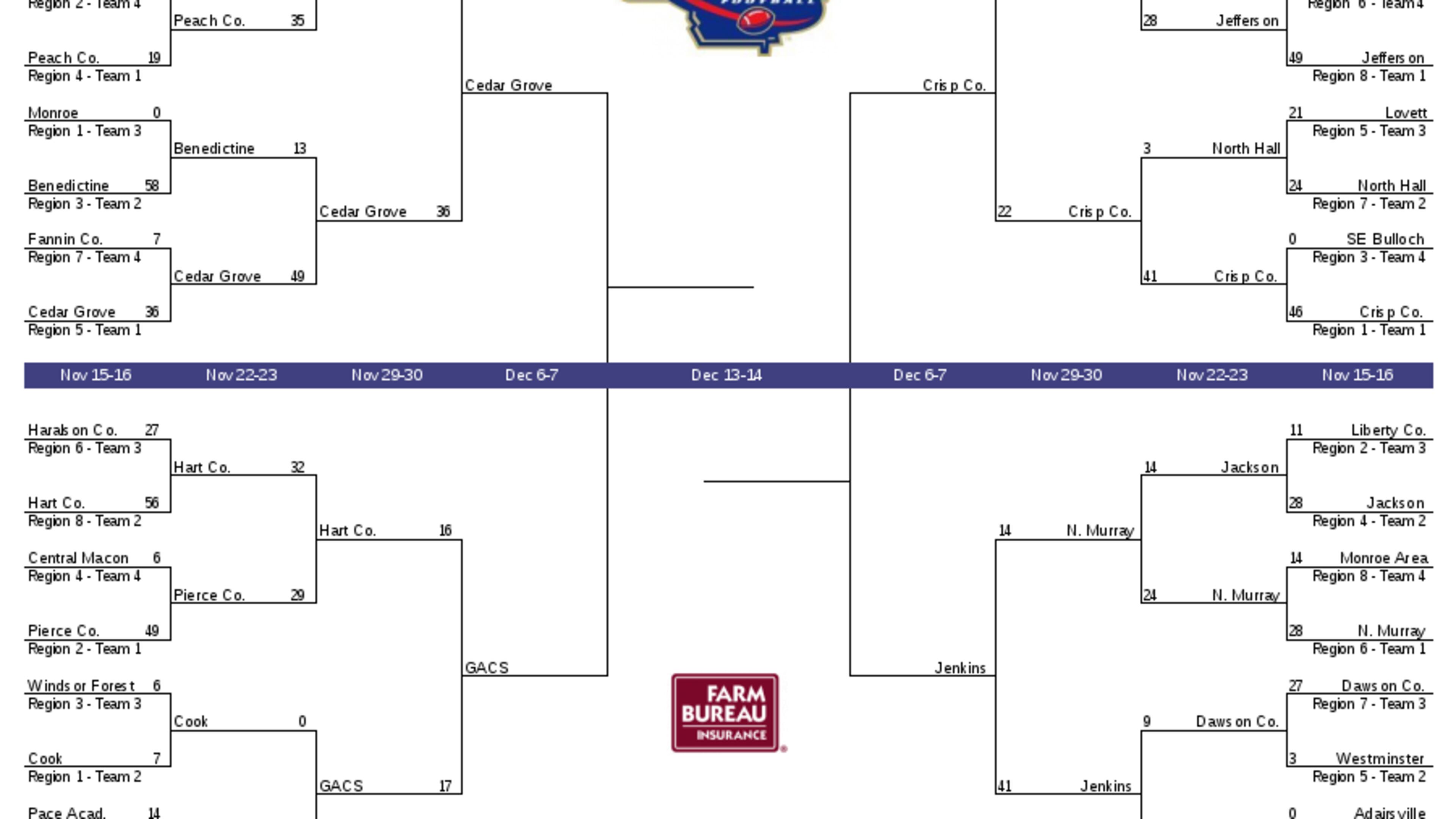 Cedar Grove, Greater Atlanta Christian, Crisp County and Jenkins are the survivors after three rounds in the Class AAA football playoffs. GAC will travel to Cedar Grove, and Crisp will entertain Jenkins on Friday.