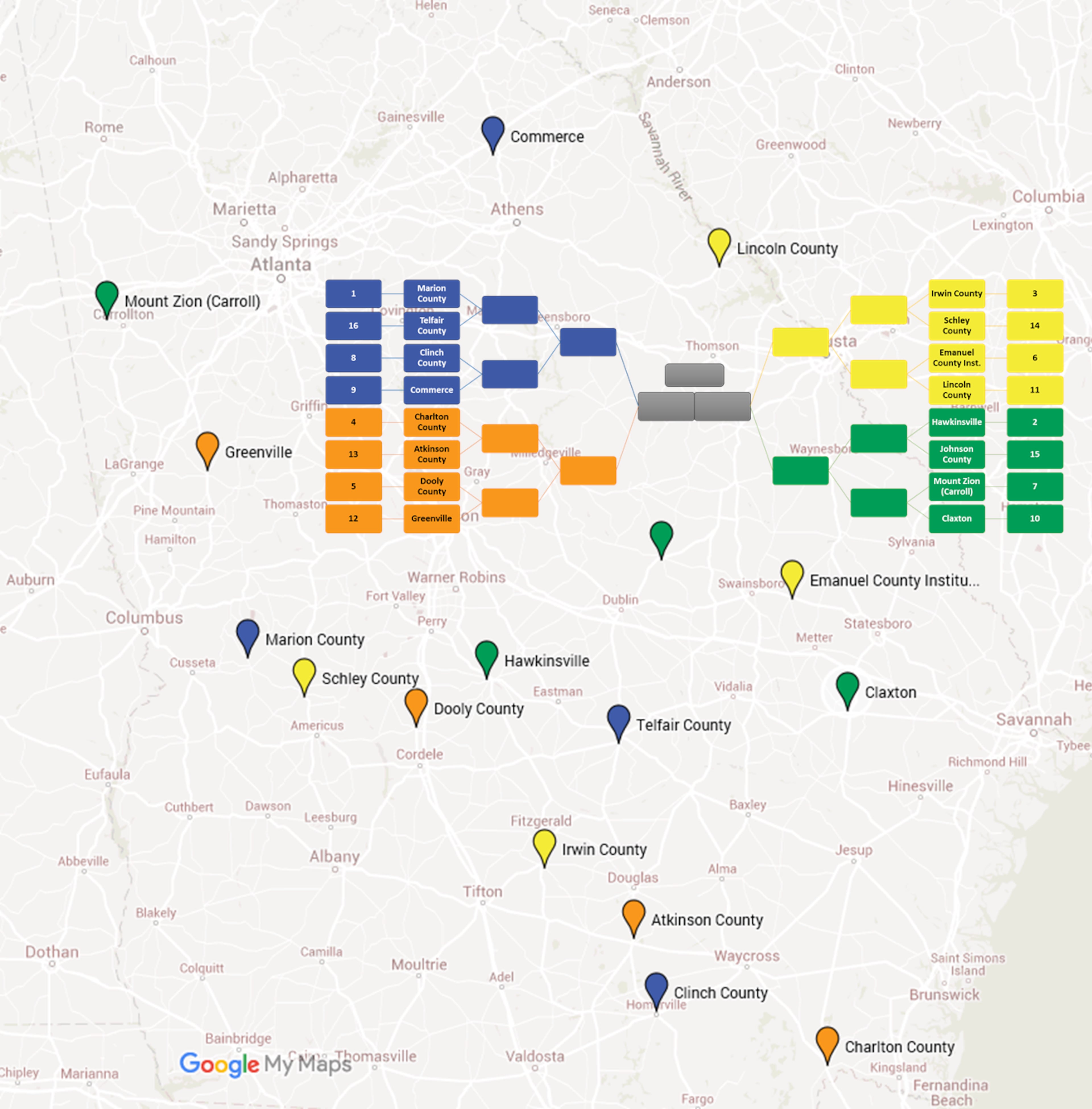 By "expected", I mean we'll assume the better seeded team wins in each instance. For example, we'll assume Marion County, the #1 seed, will defeat Telfair County, the #16 seed, while Clinch County, the #8 seed, will defeat Commerce, the #9 seed. This "expected" assumption allows us to assume a Marion County versus Clinch County pairing in the second round. So the three travel distances we're concerned with in this example are Telfair County to Marion County, Commerce to Clinch County, and Clinch County to Marion County.