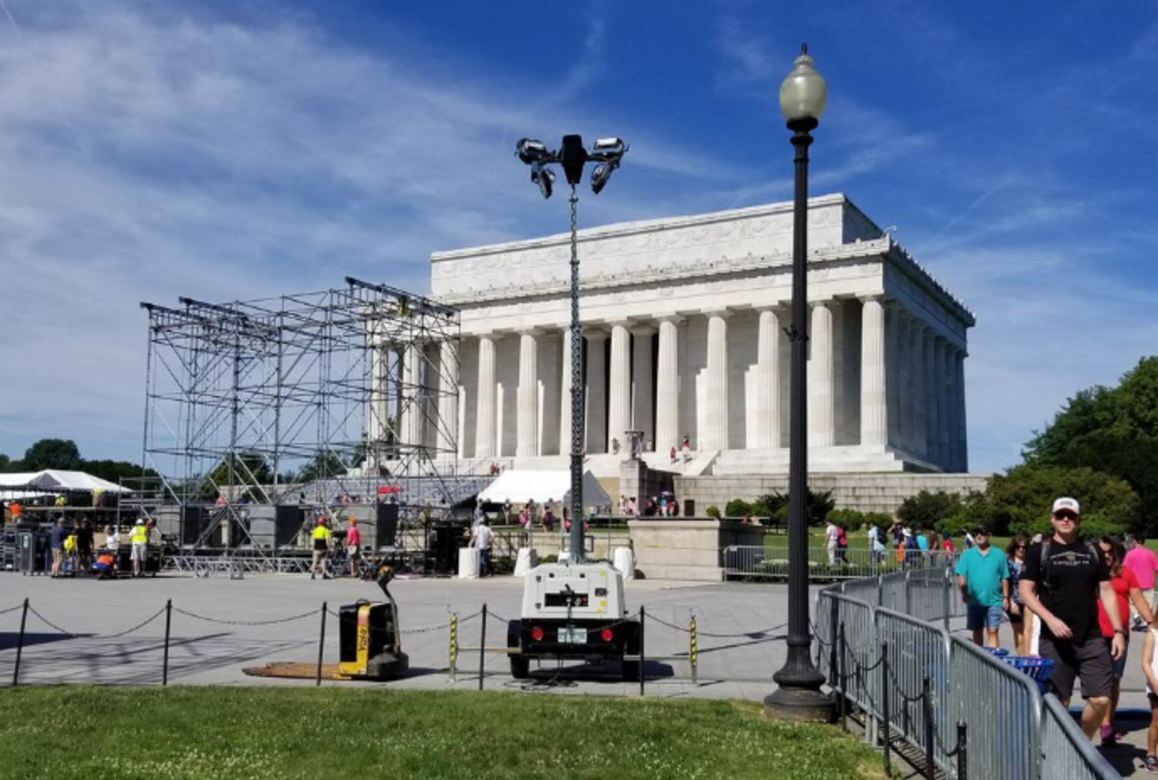 As a Marine One helicopter flew by the Lincoln Memorial on Monday morning, the shape of the new July 4th offering was taking place, with viewing stands, stages, scaffolding for TV cameras, generators, and hospitality tents filling up the area in front of the Lincoln Memorial.