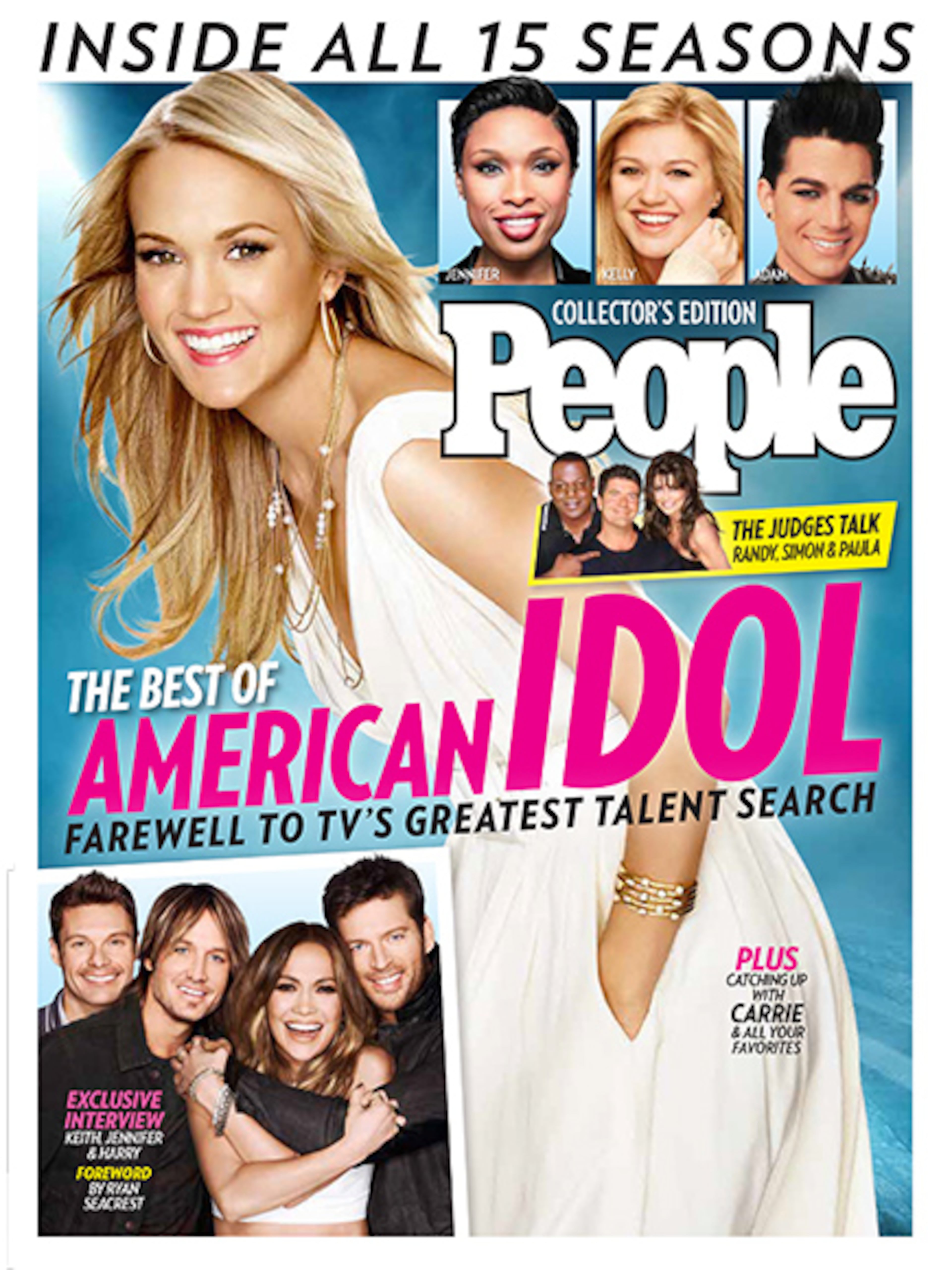 People magazine's tribute to "American Idol" on newsstands now gives Carrie Underwood top billing on the cover with three of the other biggest stars in the top corner: Jennifer Hudson, Kelly Clarkson and Adam Lambert. Plus, the original trio and the current three with Ryan Seacrest are included.