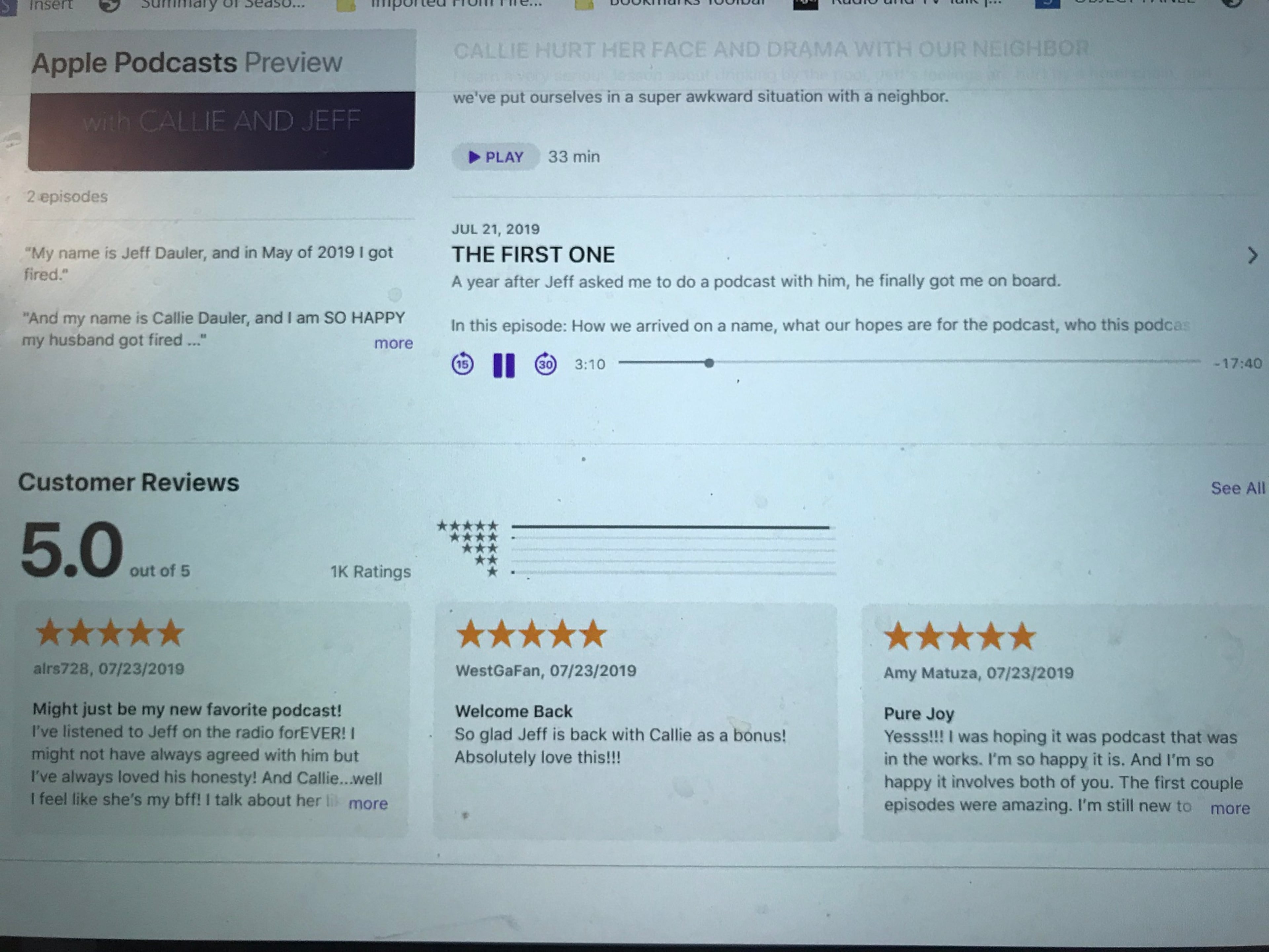 The reception to the podcast has been positive so far. As Callie noted on Facebook today: “When your husband gets fired and you throw yourself into a new business and podcast that hits #6 on Apple Podcasts with 1000 reviews its first day. What.the haiiiiiiil are we doing Jeff Dauler?!? This is insane...AND I LOVE IT.”