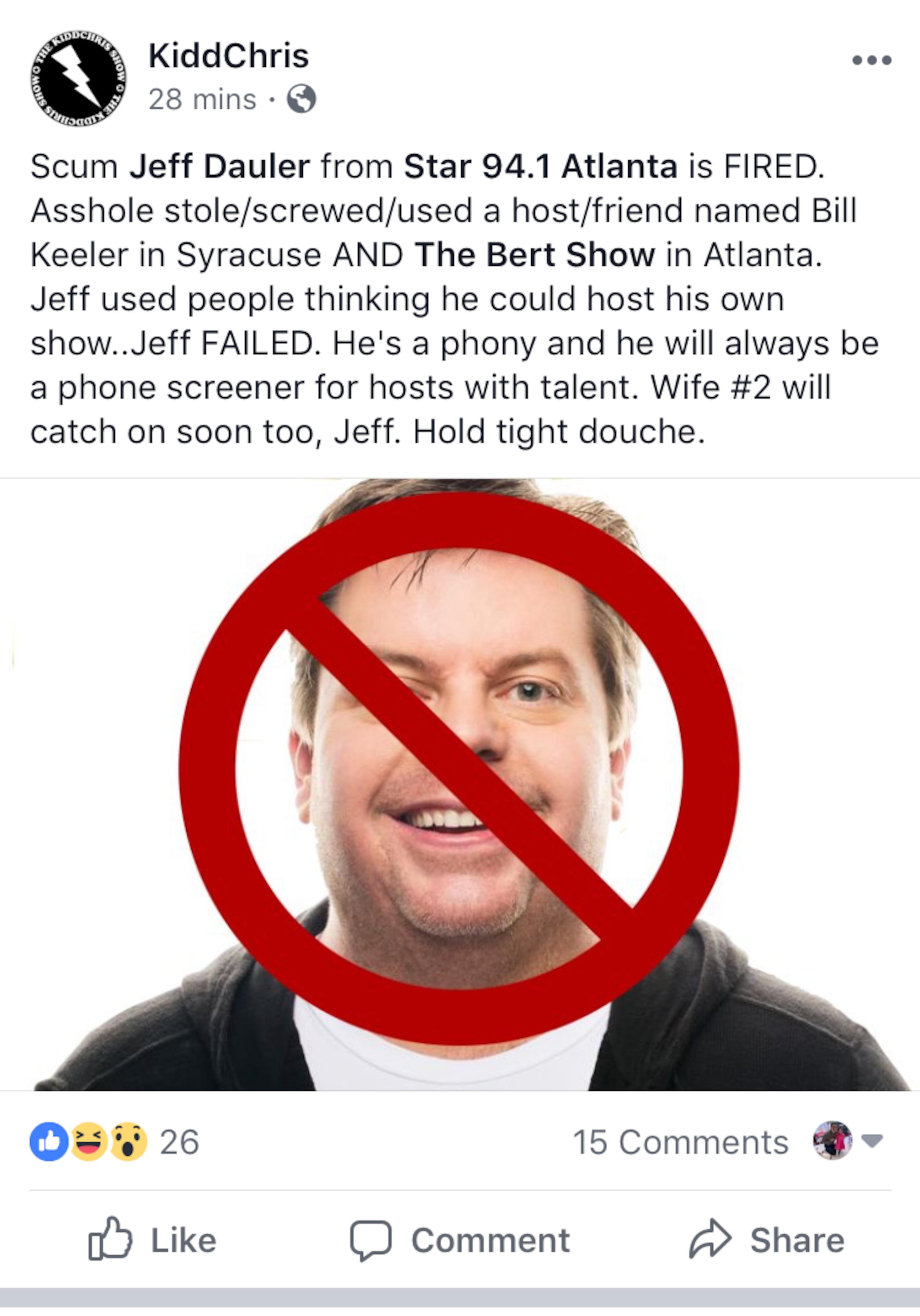 On Sunday, Chris put Dauler on blast on Facebook. He worked briefly with Dauler at a station in Syracuse many years ago while Chris was a high school intern.