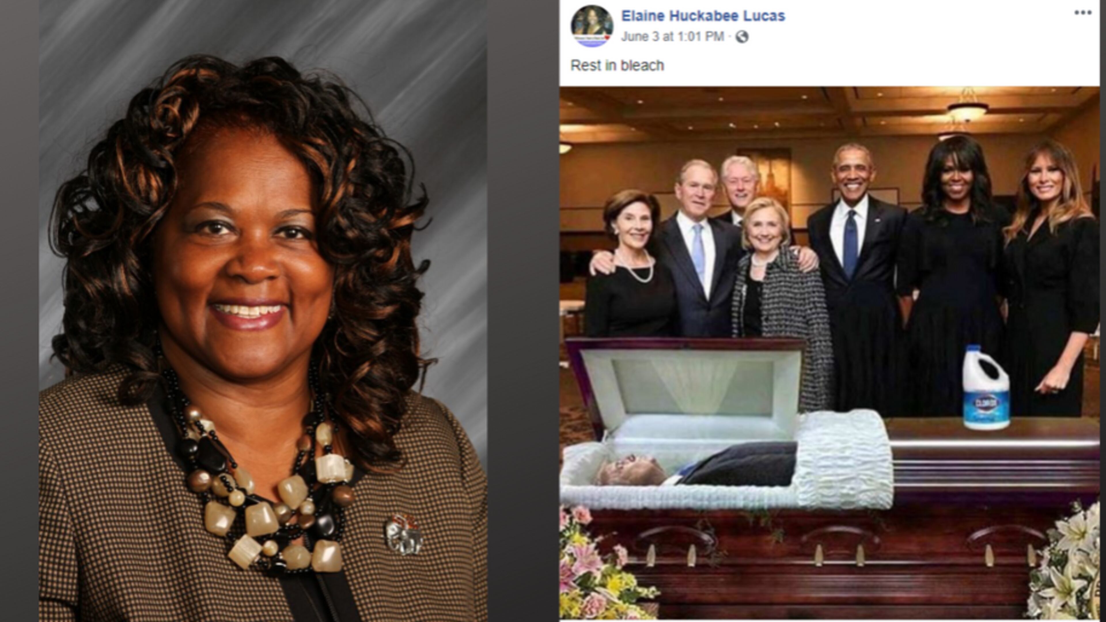 The post, made to Lucas' Facebook page June 3, according to WGXA, shows President Donald Trump in a coffin surrounded by Bill Clinton, George Bush, Hillary Clinton and others. A bottle of bleach is on the casket. The caption reads "Rest in bleach."