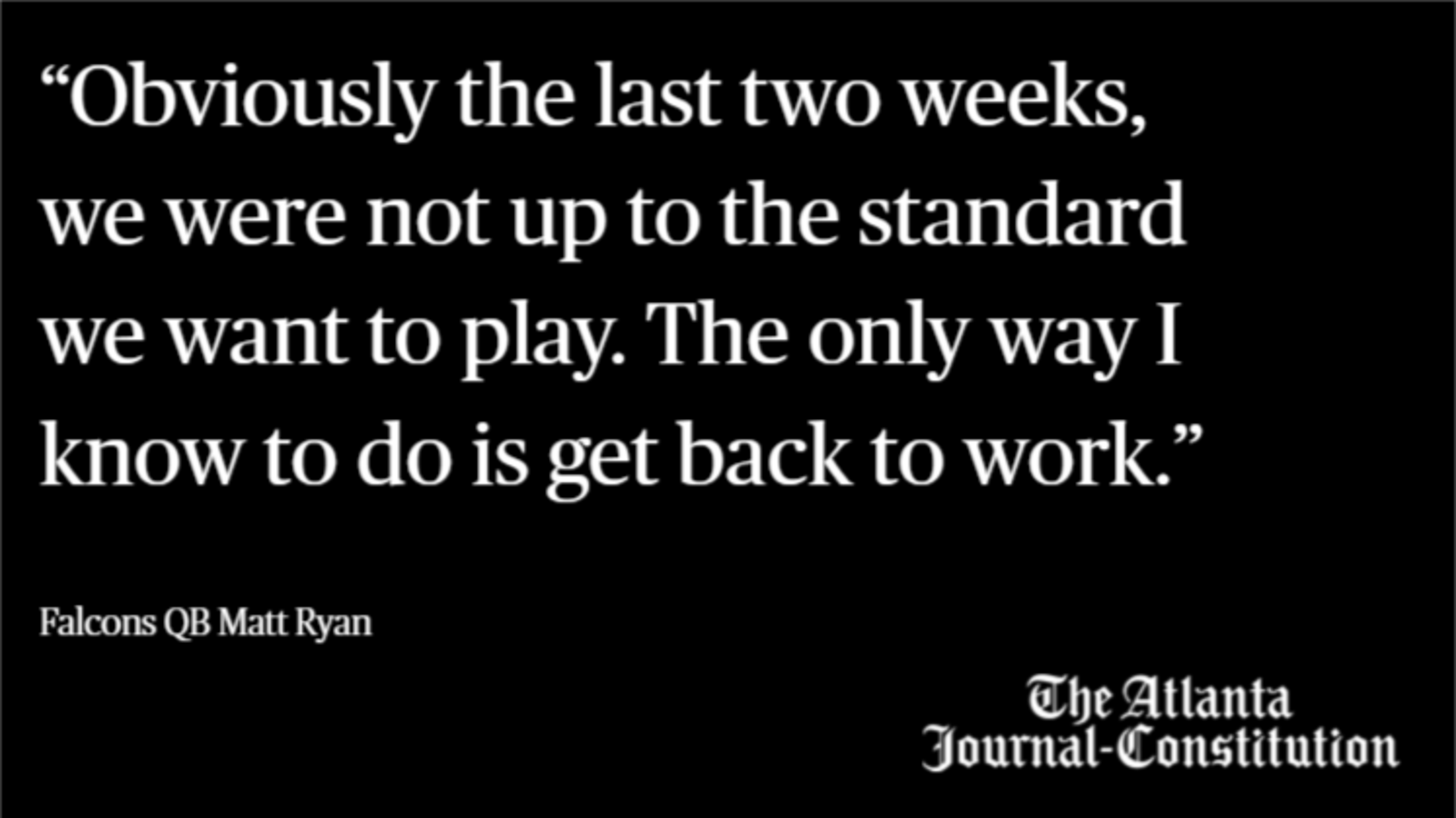FLOWERY BRANCH -- Until the past two games, Falcons quarterback Matt Ryan, who’s in his 14th season in the NFL, had never two sub-60 passer-rating games back-to-back.