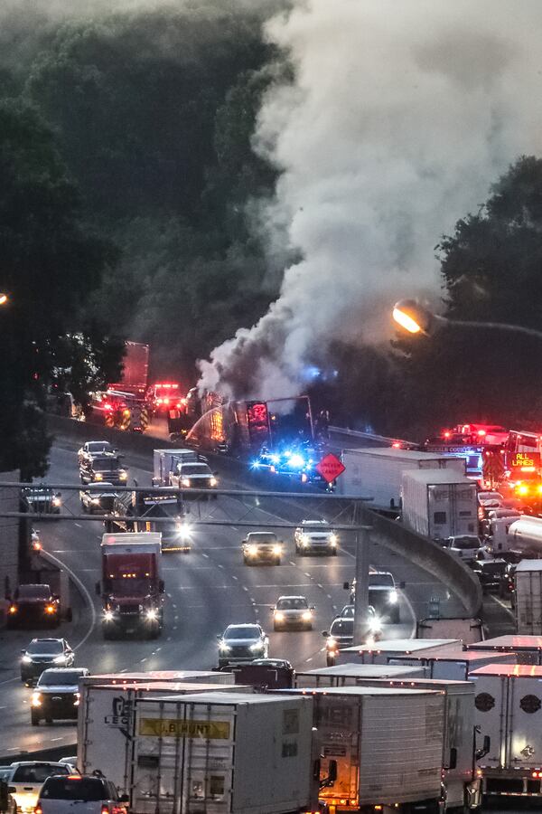 All eastbound lanes were shut down at Flat Shoals Parkway around 4:45 a.m., when the big rig was involved in a multivehicle wreck and burst into flames.
