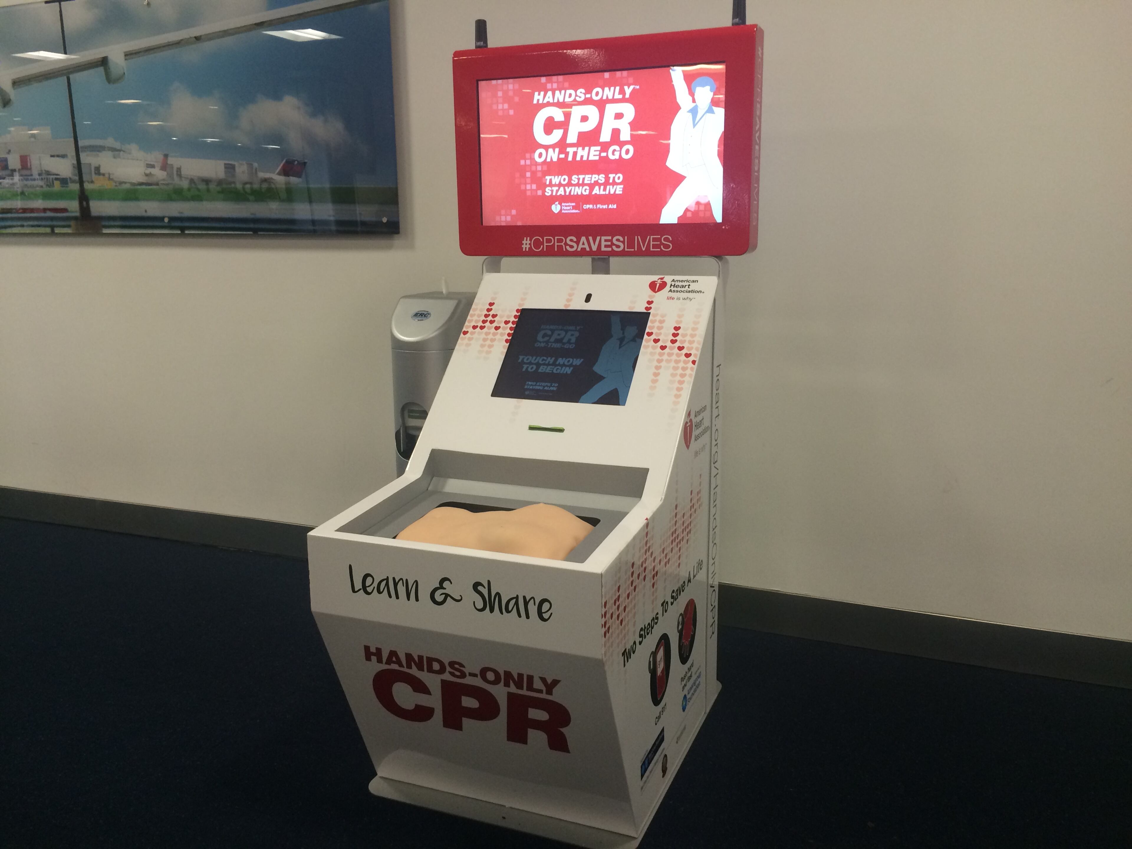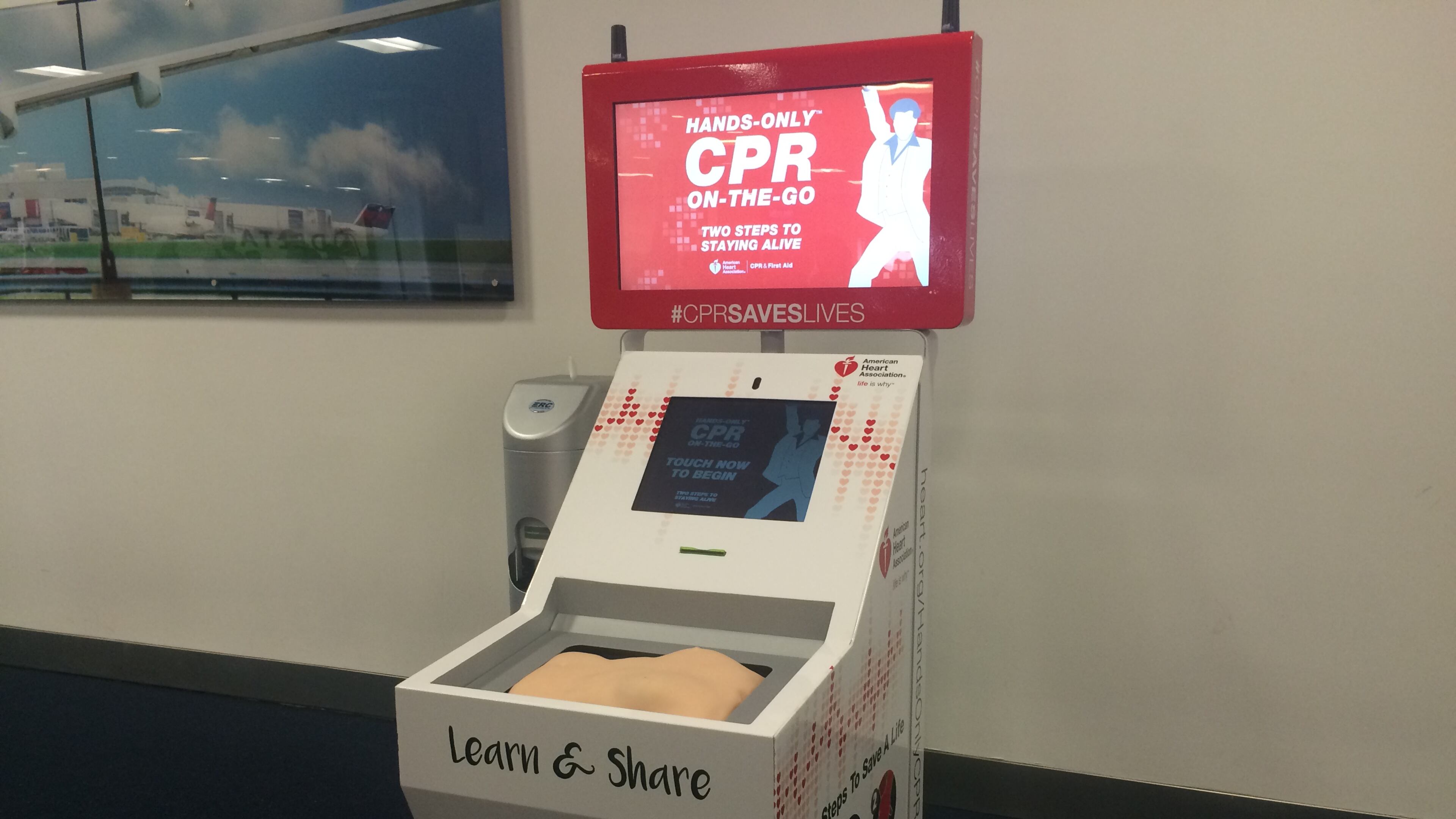 The interactive kiosk, which sits against a wall on Concourse A between gates A11 and A15, shows a how-to video on "hands-only CPR." It includes a mannequin torso for practice compressions to the beat of the Bee Gees' Stayin' Alive. The kiosk gives feedback about proper hand placement and the rate and depth of compressions.