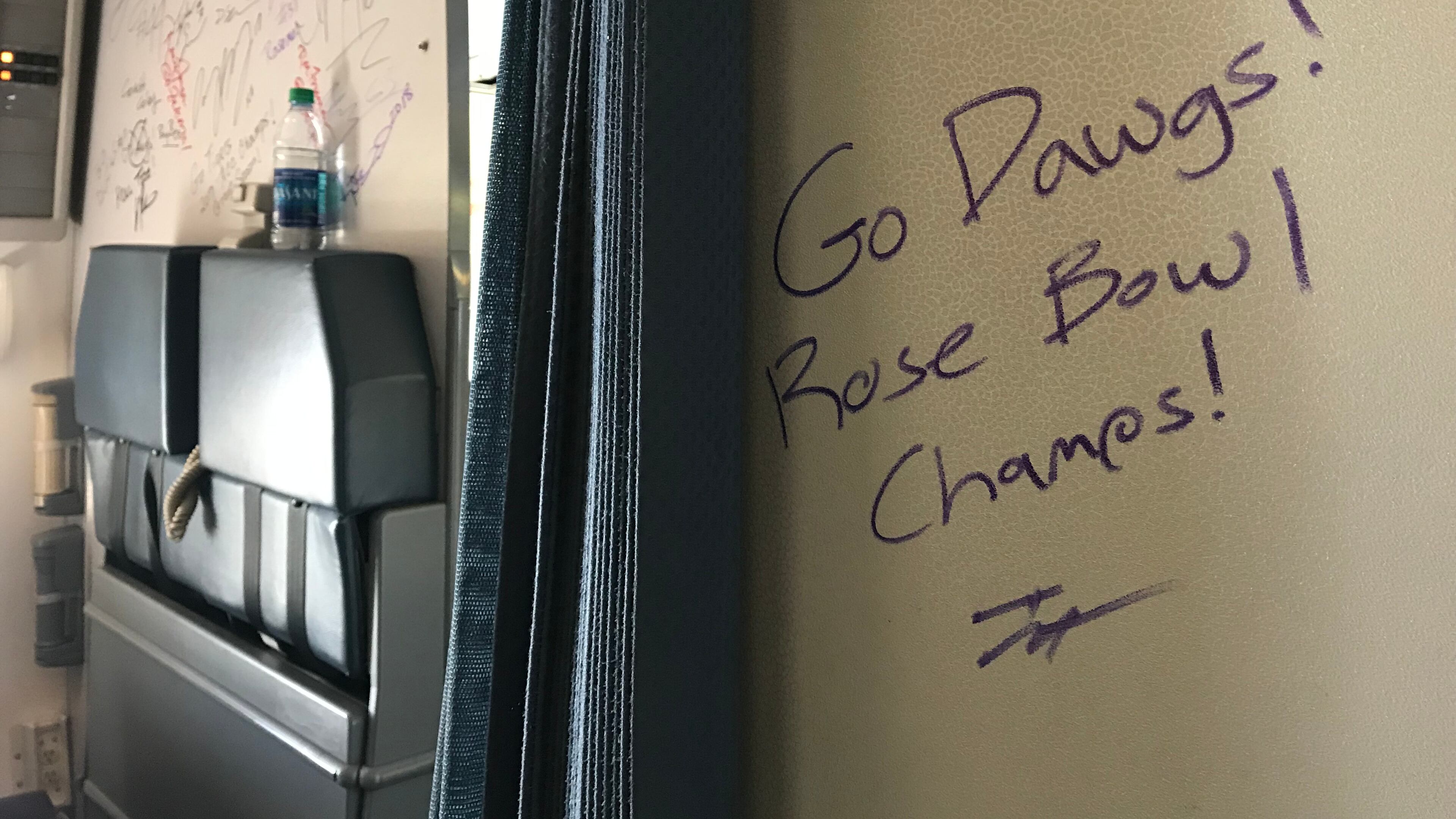 As Delta Air Lines retires the Boeing 747 from its fleet, one of the jumbo jet's final missions was flying the Georgia Bulldogs to the Rose Bowl -- and team members had the chance to leave their mark.