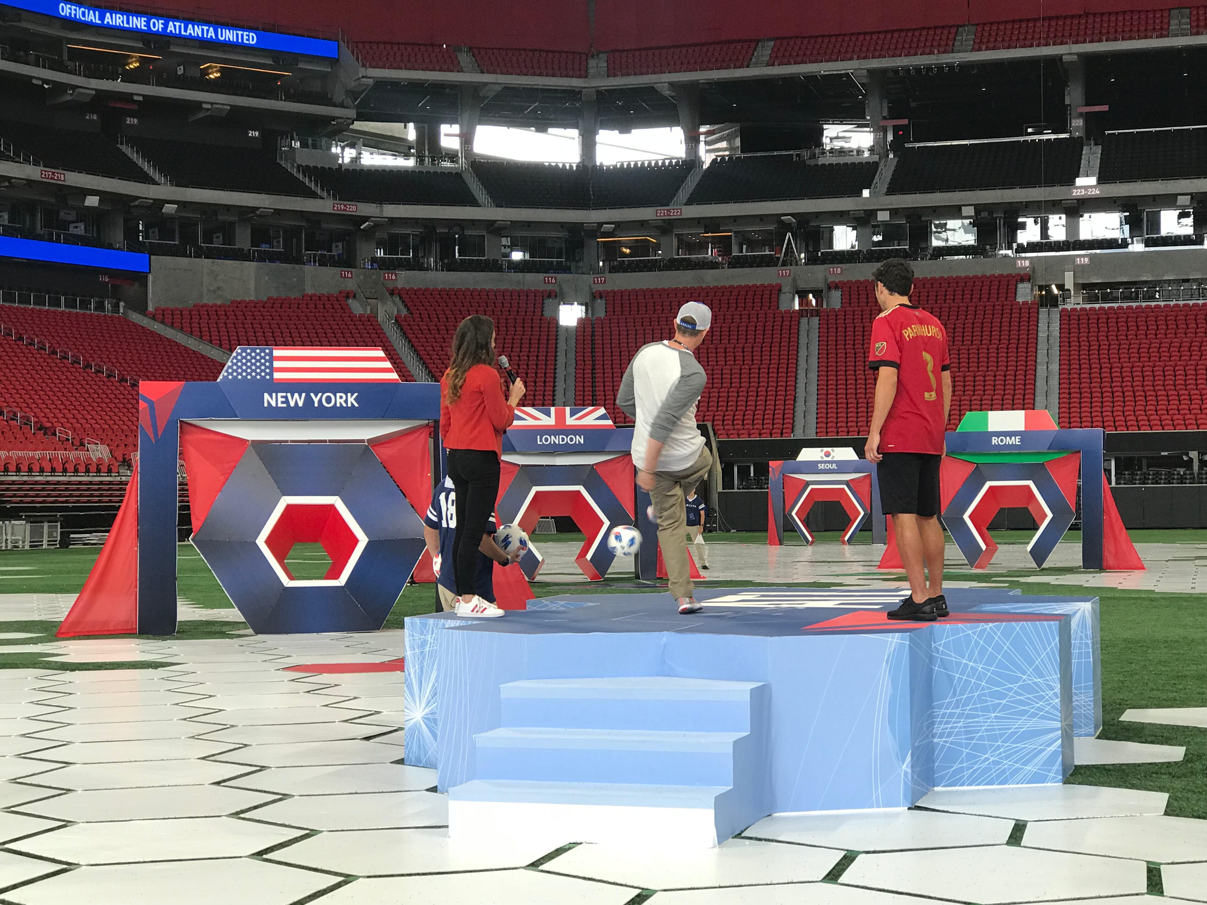 The event, part of Delta's sponsorship of Atlanta United and the stadium, involved about 200 Delta customers, employees and Atlanta United fans trying to kick a soccer ball into goals named for cities Delta flies to from Atlanta.