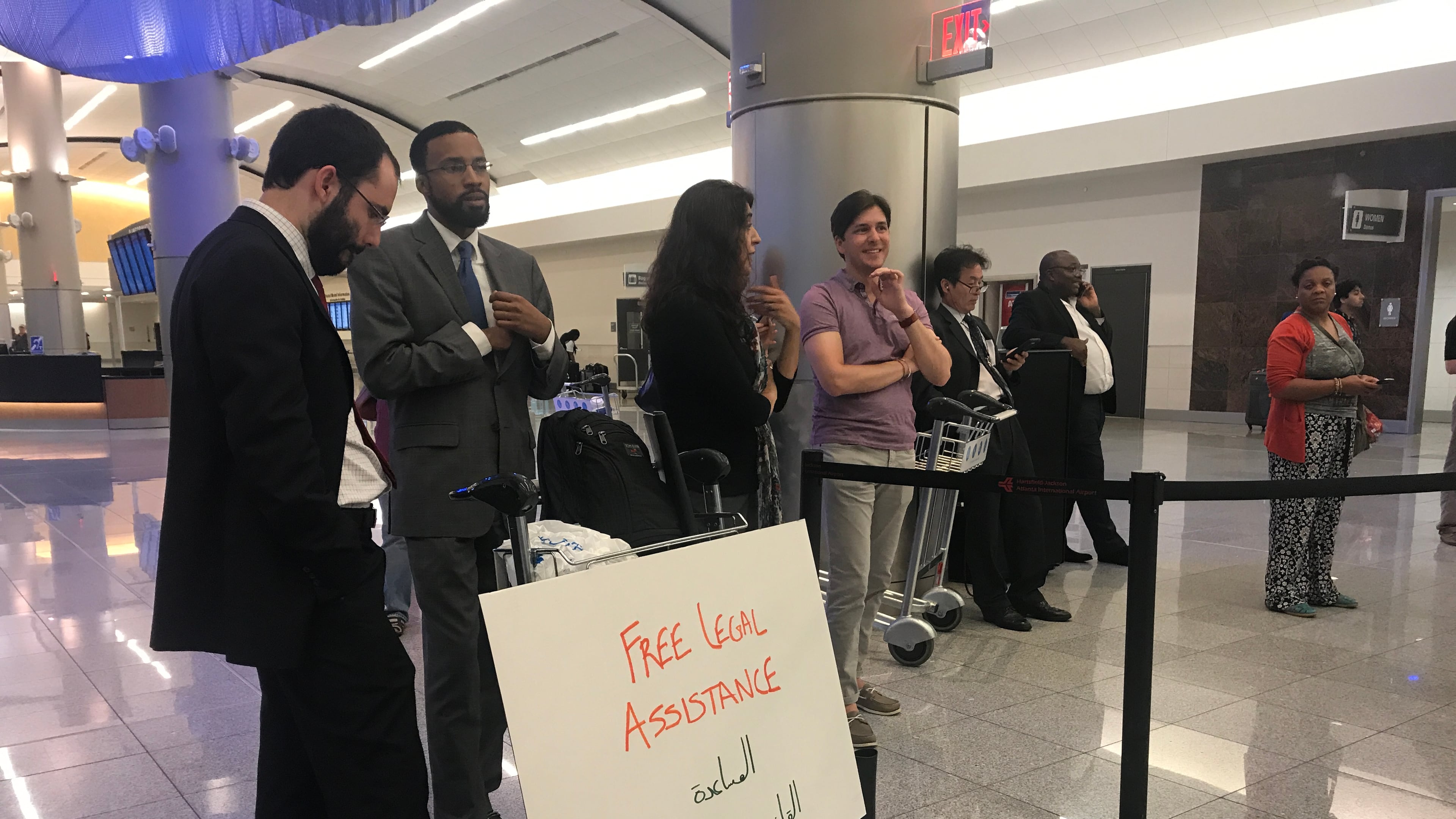 Edward Ahmed Mitchell, executive director of the Council on American-Islamic Relations' Georgia chapter, was among those waiting with a sign offering legal assistance in the arrivals area of the Atlanta airport's international terminal Thursday evening.