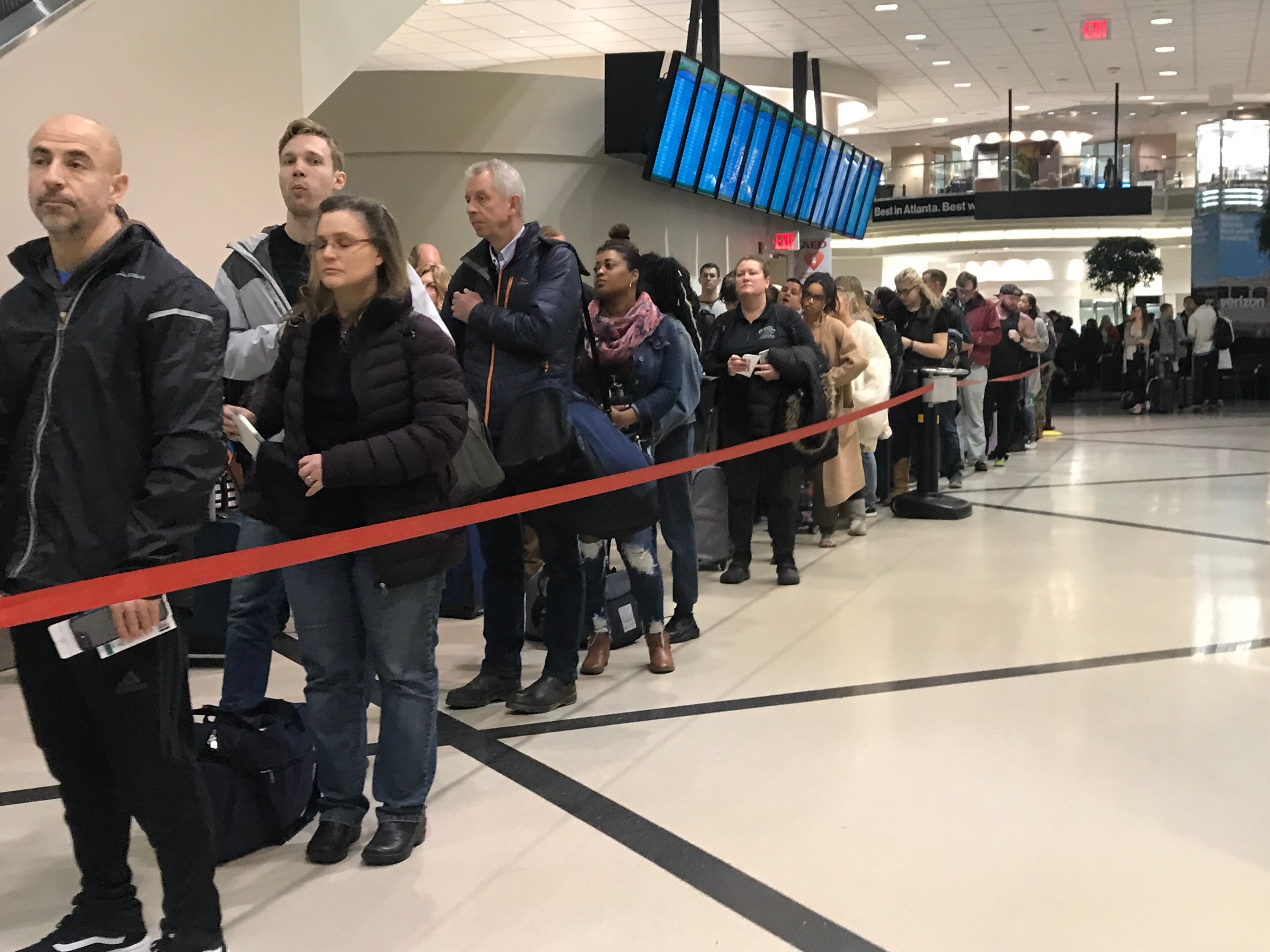 But wait times have still extended to 30 to 45 minutes during peak morning periods at the Atlanta airport. Lines typically shorten by mid-morning.