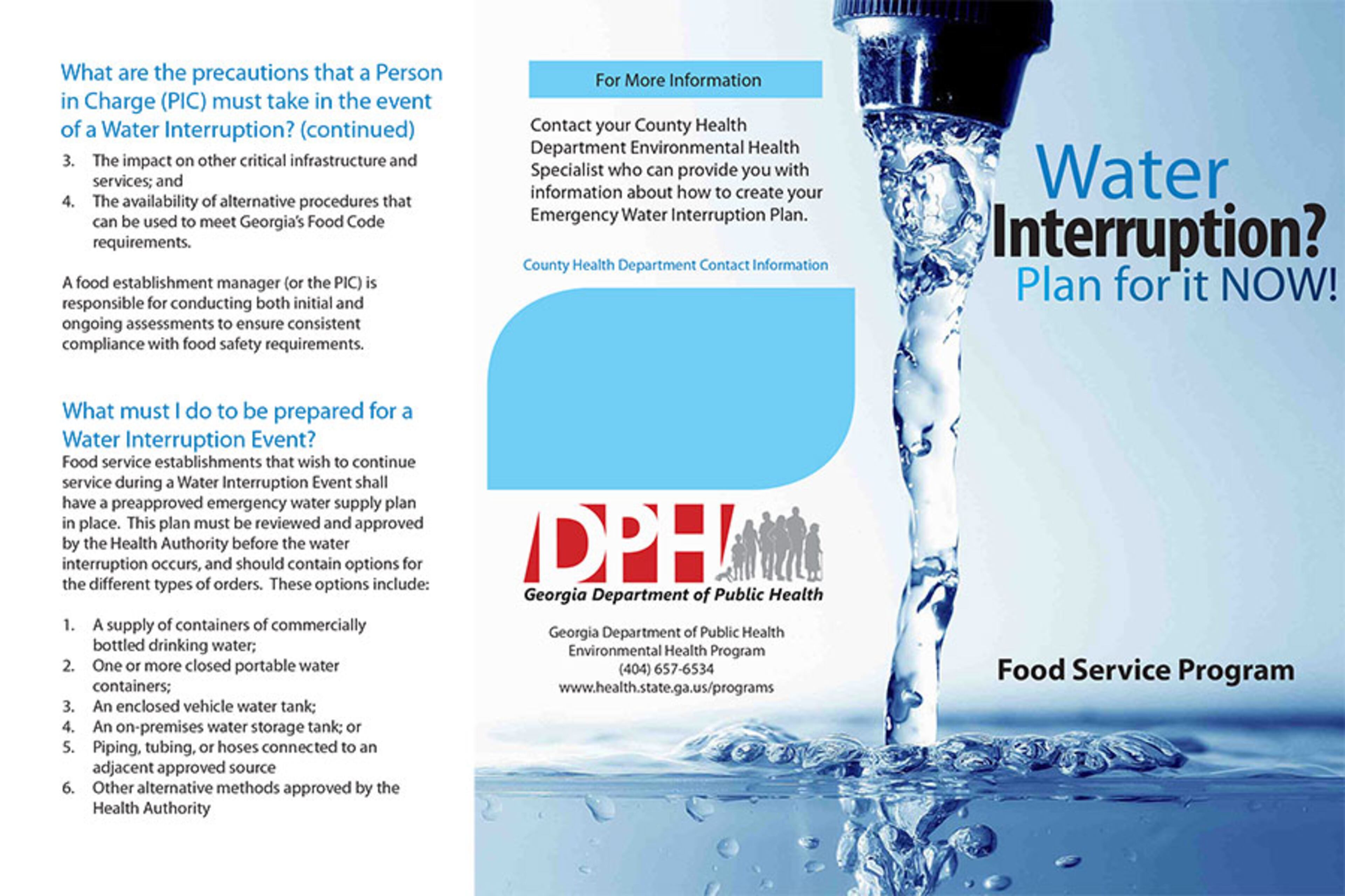 Per the Georgia Department of Public Health Water Interruption Brochure for food service programs: