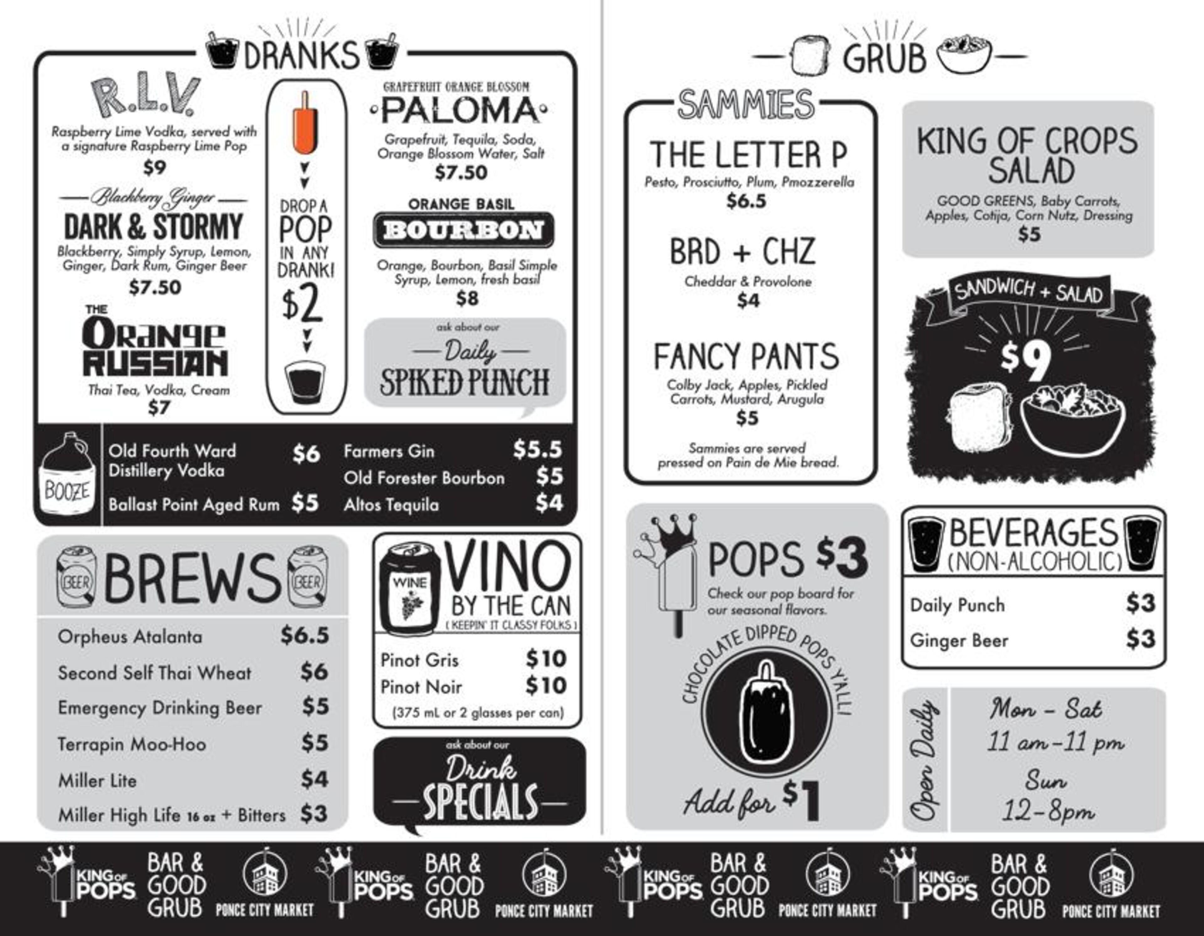 It is the first Brick and Mortar location for the company, and in addition to the pops they’ve built their reputation around, they will be unveiling their bar program. Neil Ringer is managing the project, and has come up with a really unique menu. It starts with a hand squeezed, fresh daily punch (think Grapefruit Mint, Hibiscus Limeade, Tangerine Basil) which we encourage you to spike. In addition to the punch there are several local beers, canned wine and cocktails based on pop flavors like a Blackberry Ginger Dark & Stormy, Thai Tea White Russian, Raspberry Vodka Lime, and more. Make it a poptail by dropping a perfectly paired King of Pops pop into it.