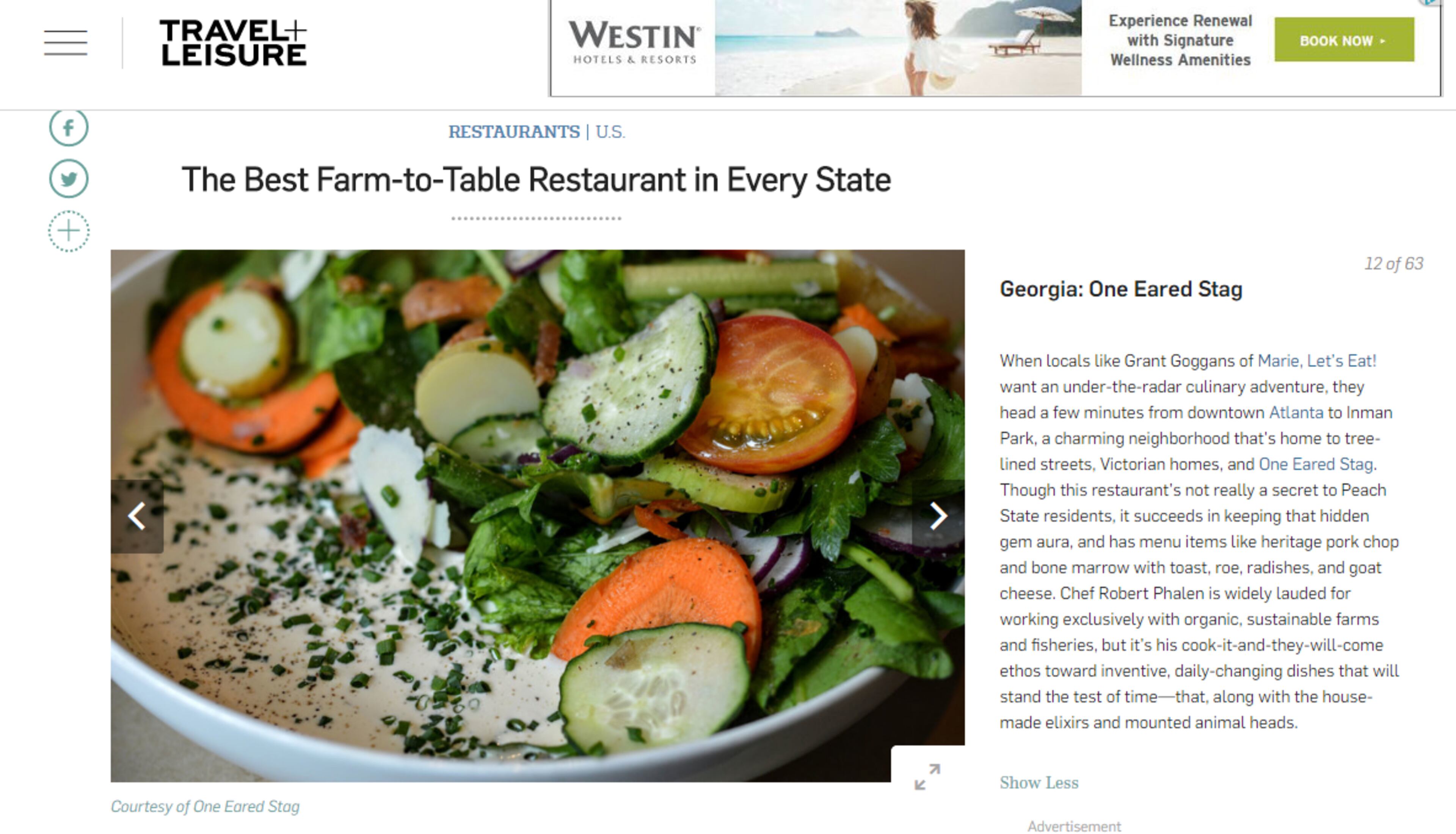 Travel & Leisure magazine recently published its list of the best farm-to-table restaurants in the U.S. Who earned top honors from Georgia? Atlanta's own One Eared Stag .
