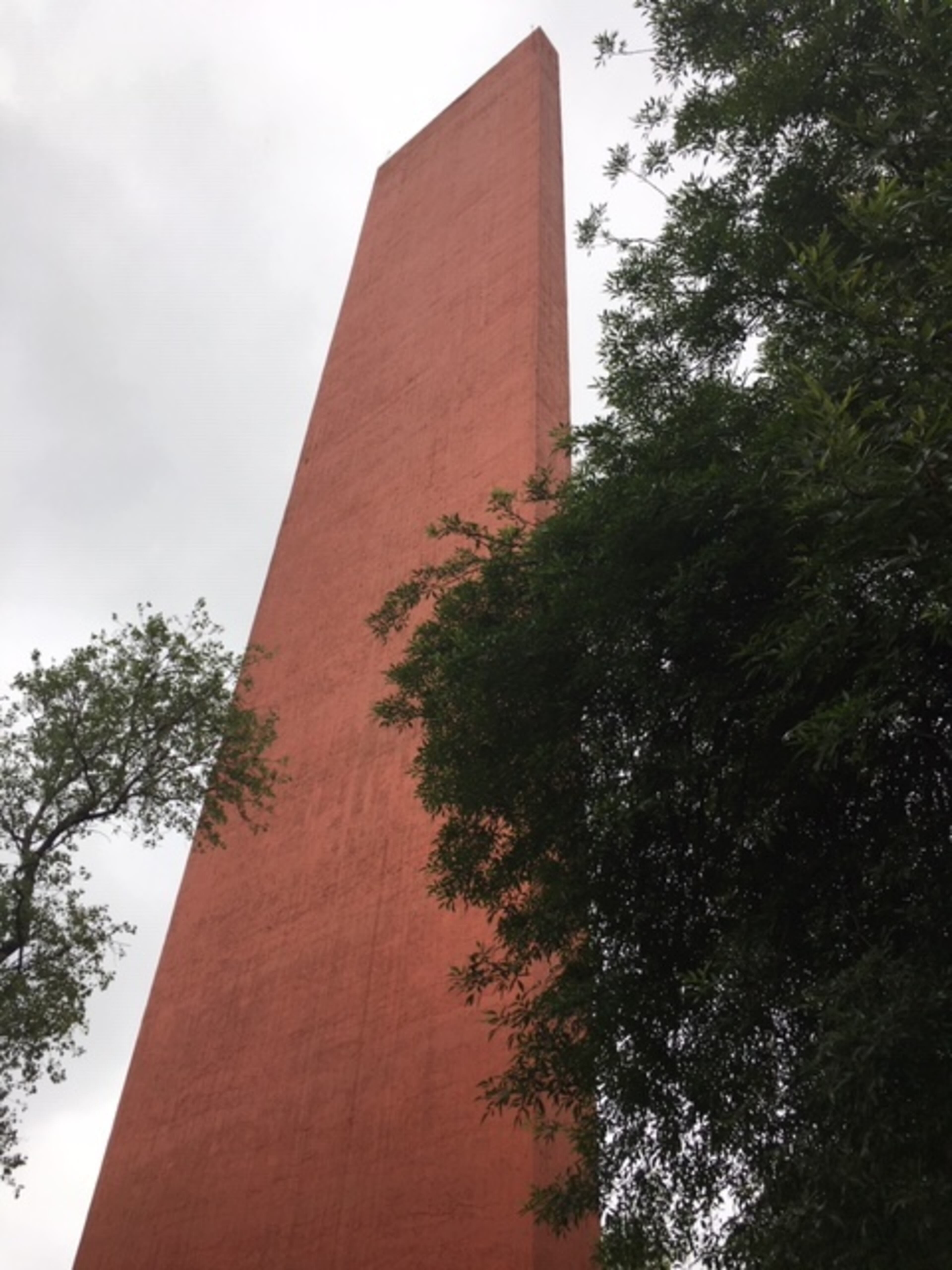 It is the Commerce Beacon. It was designed by famous Mexican architect Luis Barragnan. It was inaugurated in Dec. 1984. It takes 360 liters of paint to cover it. It’s orange. Not a Tennessee or Clemson or Texas orange. It is its own orange.