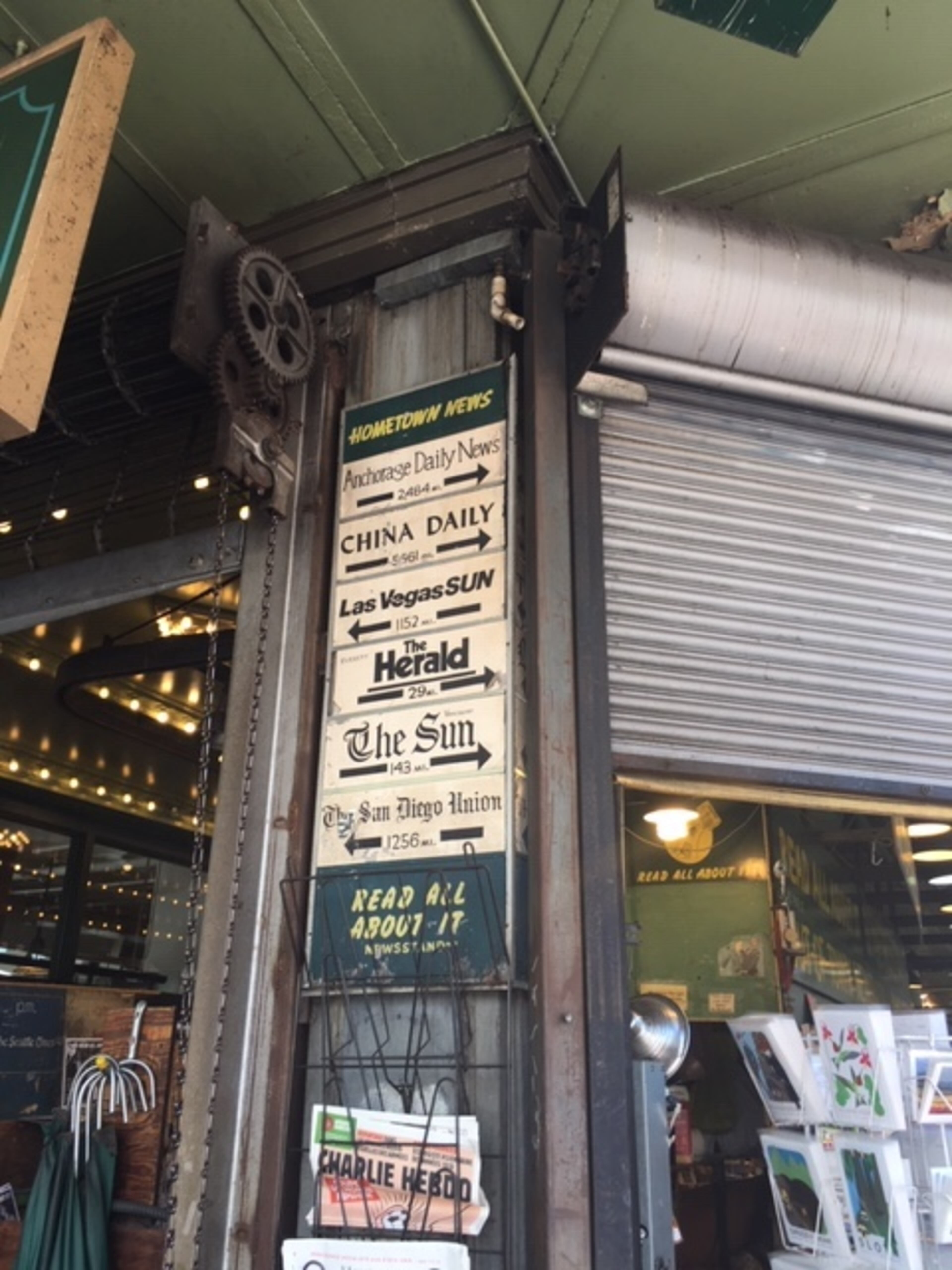 Of the many cool signs in Seattle, I appreciated this one the most because of the cosmopolitan newspapers that can be bought throughout the city:
