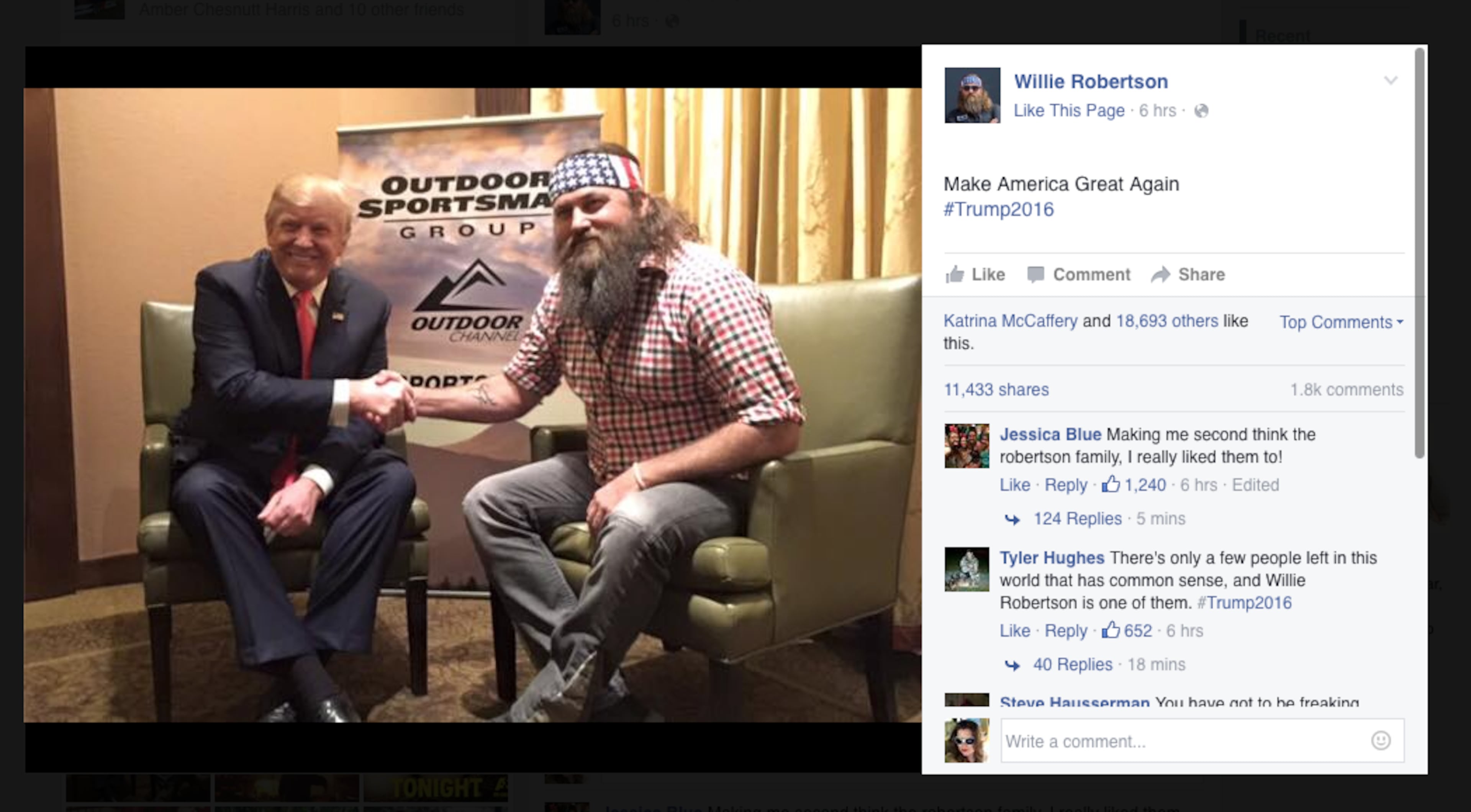 "I am truly honored to receive Willie Robertson's endorsement tonight!" he posted. "He is a great person, has had tremendous success and a really terrific family. He believes in my message and knows that I am the only one who will Make America Great Again!"