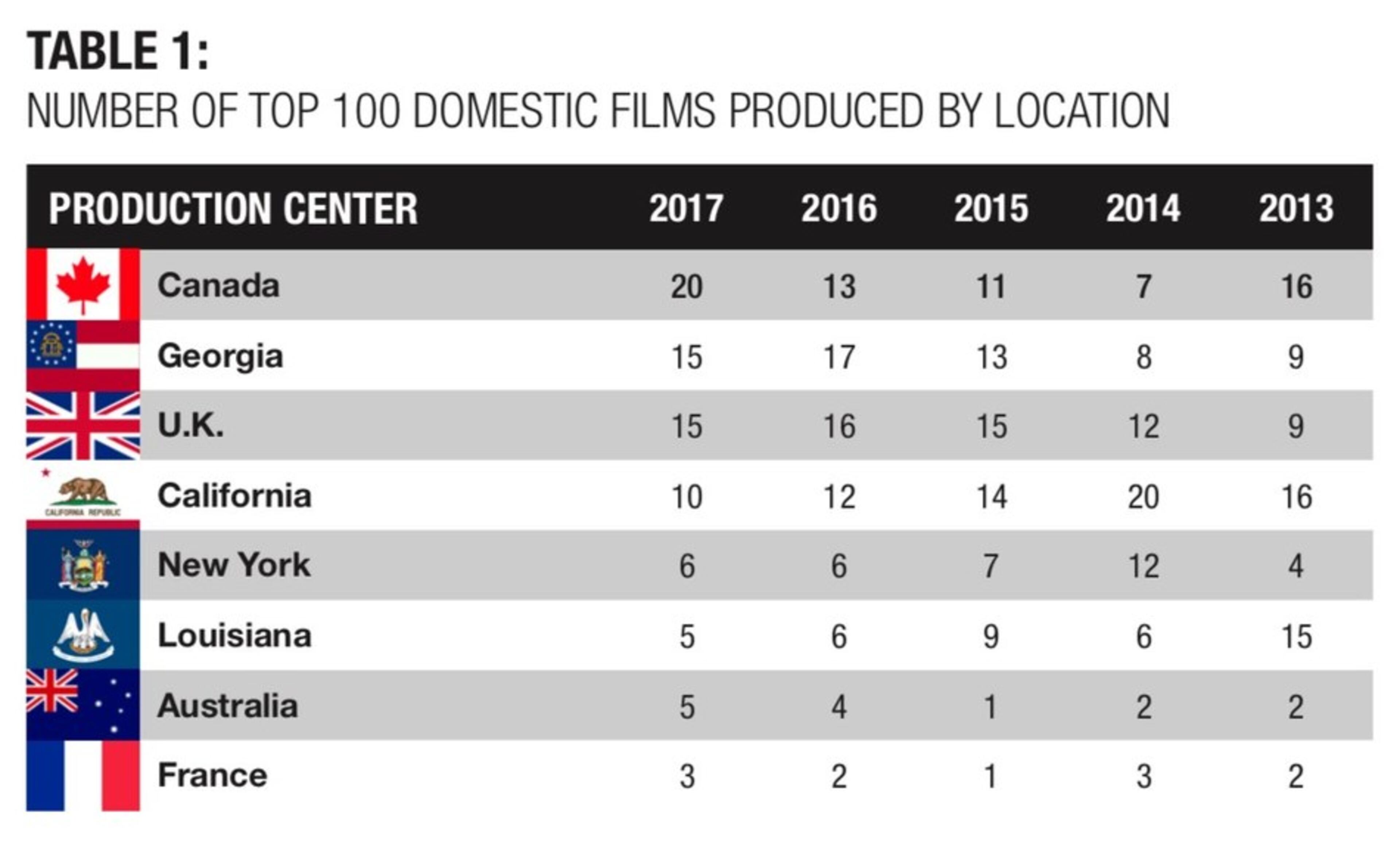 Unlike 2016, when Georgia held the top spot in the world with 17 projects, Canada emerged the victor with a record 20 films. It’s the country’s first time in the No. 1 spot.