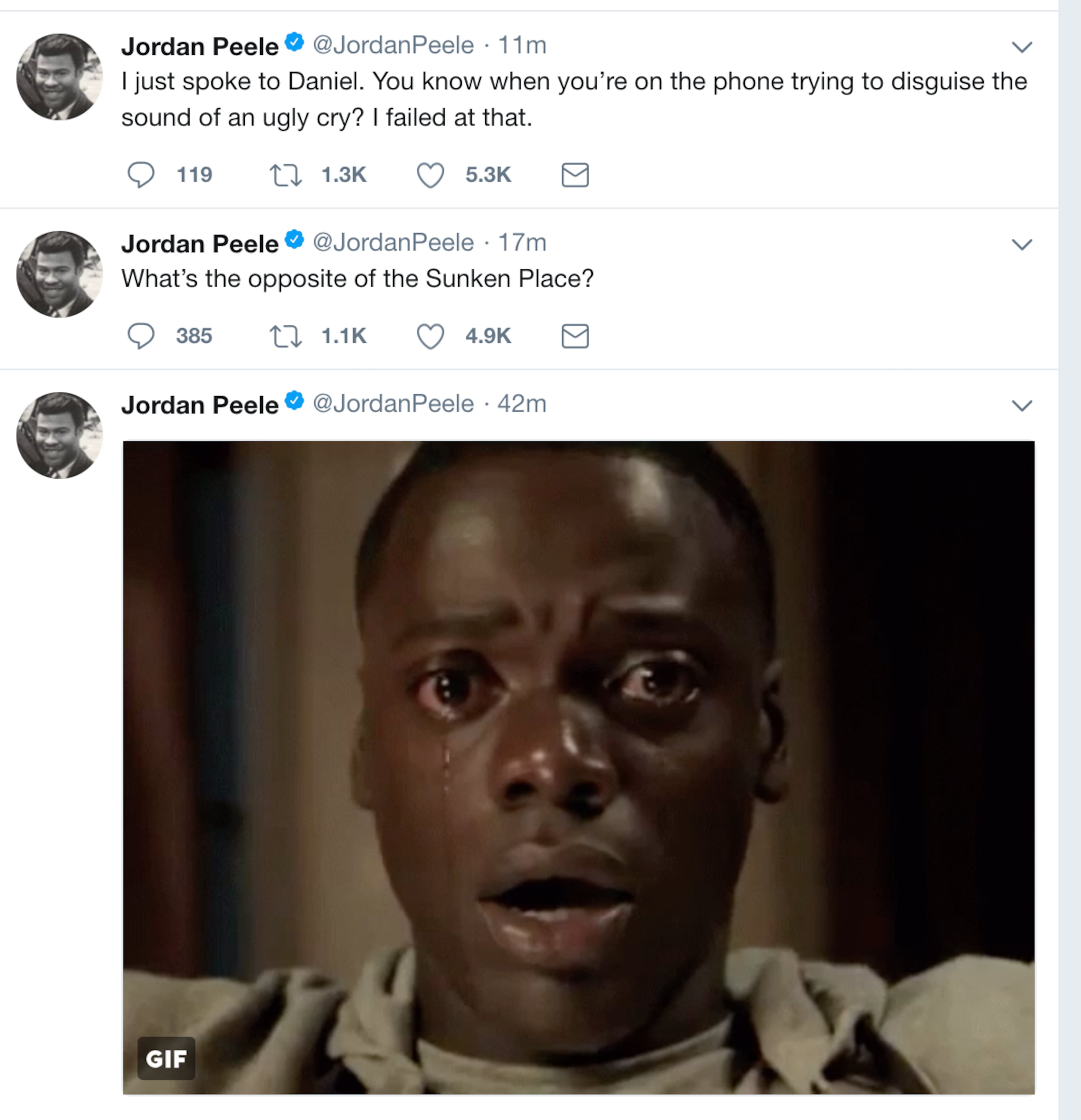 "'Get Out' is a documentary," Peele intoned via Twitter ahead of the Globes. He's up for best director and best original screenplay and Daniel Kaluuya is up for best actor. Peele's tweets have been celebratory this morning: