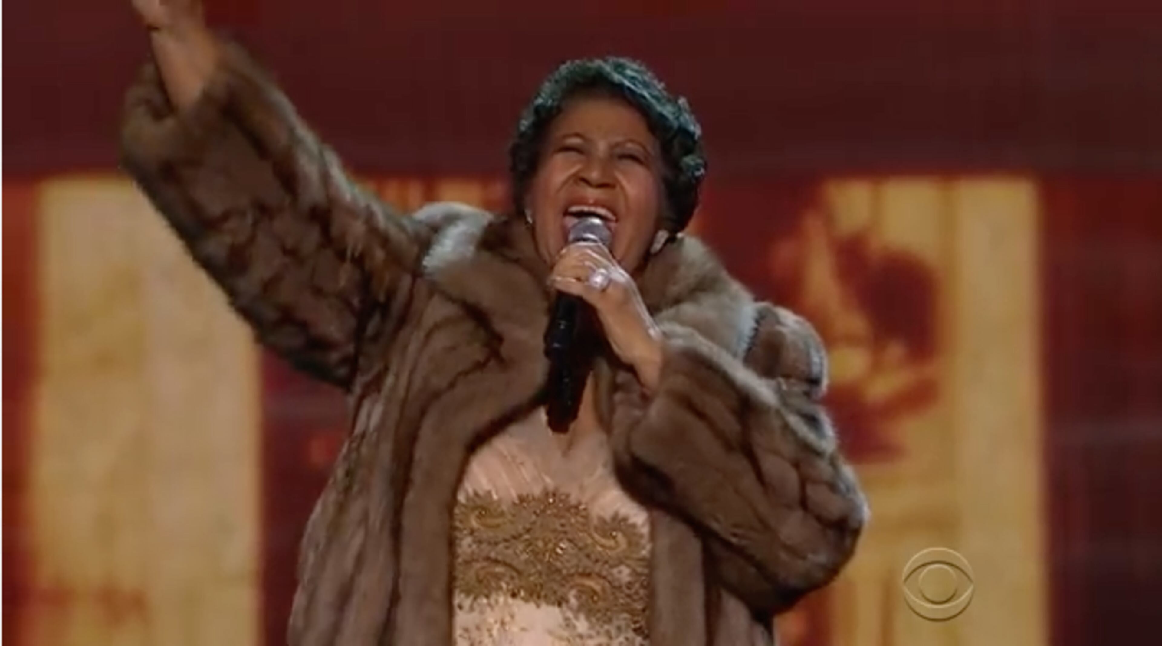Franklin, looking gorgeous in an elegant gown with a full-length fur coat, brought the house down with her powerhouse vocals.