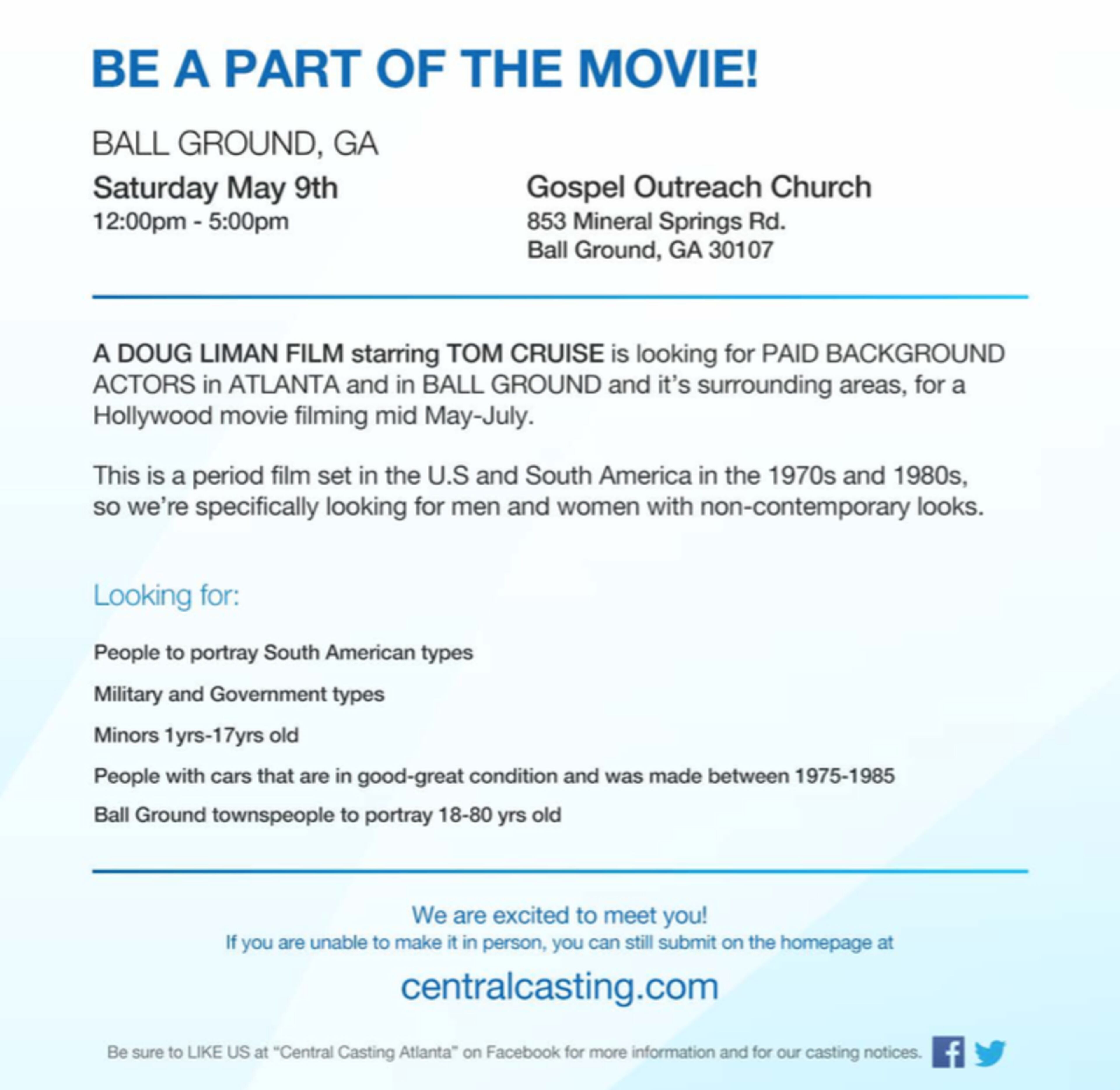 The new Tom Cruise movie "Mena," filming in and north of Atlanta this summer, holds an open casting call this Saturday.