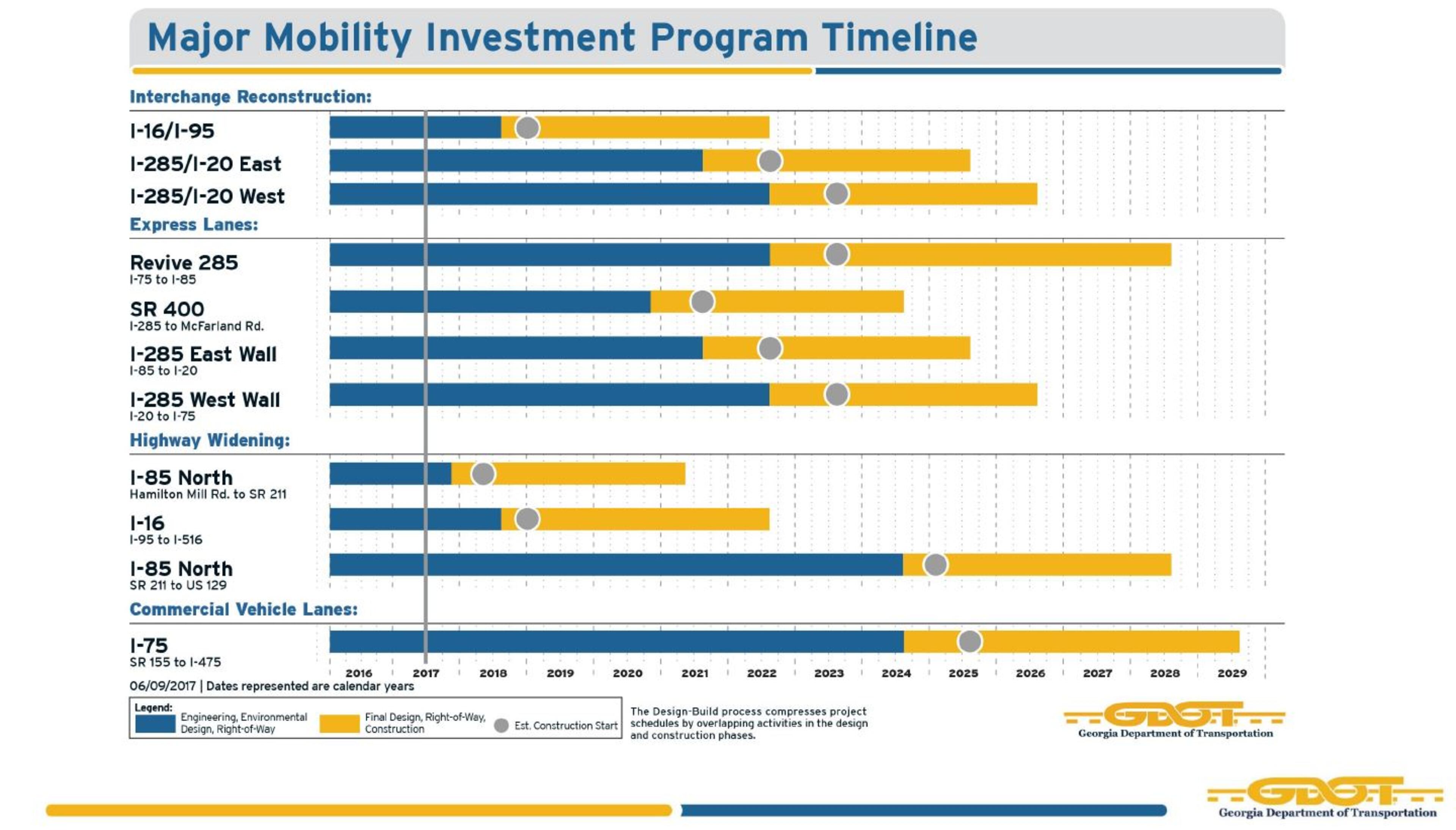 Here are two GDOT timelines that illustrate the changes to the state’s “Major Mobility Investment Program.” The first is from 2017. You can click on the image to make it bigger: