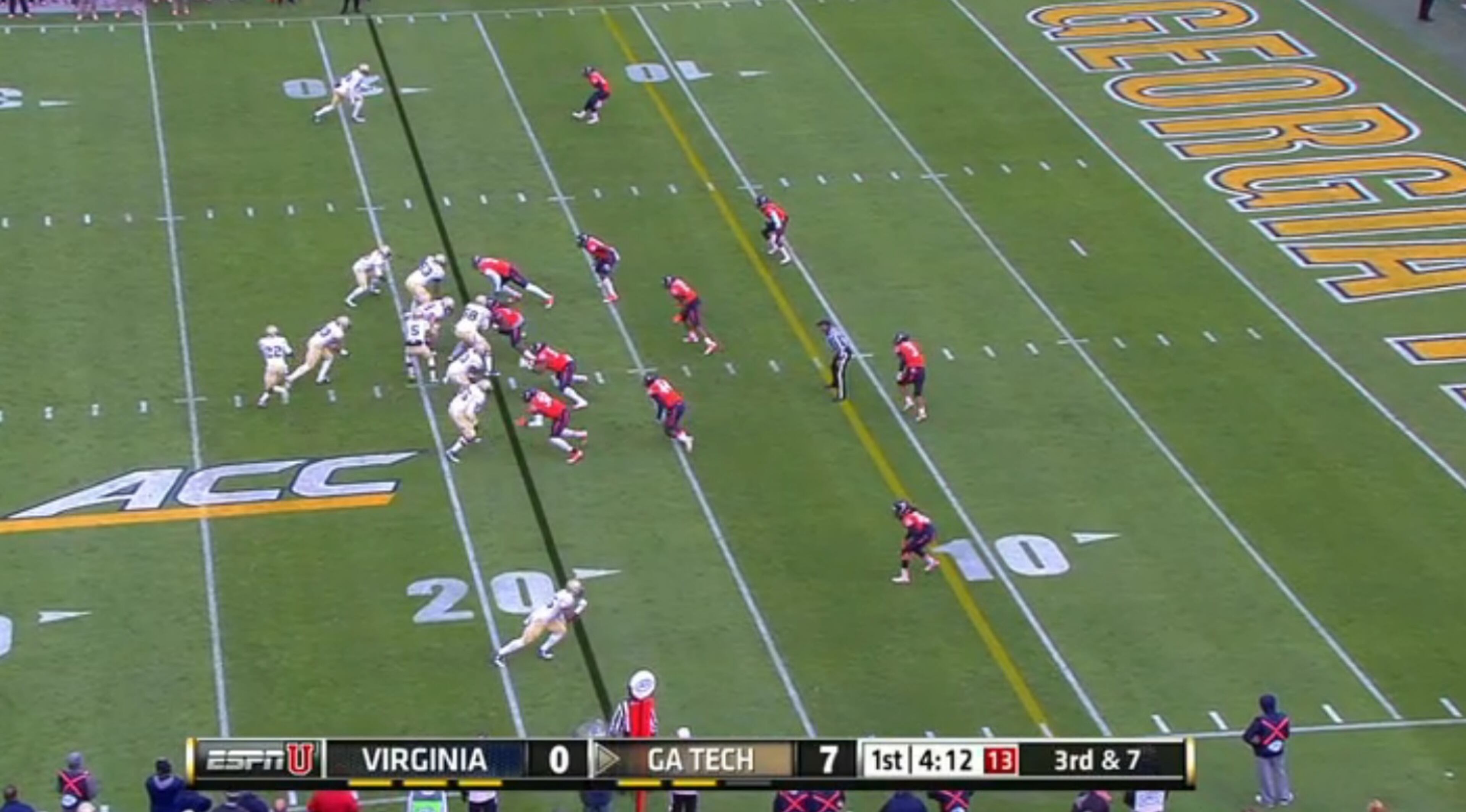 Third-and-7 from the Virginia 18-yard line. Tech is lined up in its standard formation with Broderick Snoddy (near side) and Tony Zenon at A-back and DeAndre Smelter is the near-side wide receiver. Virignia is in a 4-3, with middle linebacker Daquan Romero lining up deep, a common alignment against Tech.