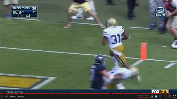 There were 32 seconds left when Georgia Tech quarterback Justin Thomas brought the Yellow Jackets to the line for a third-and-6 play on the Georgia Southern 13-yard line. You presumably know what happened next, but here's a closer look at how it unfolded. You can watch the replay here or here.