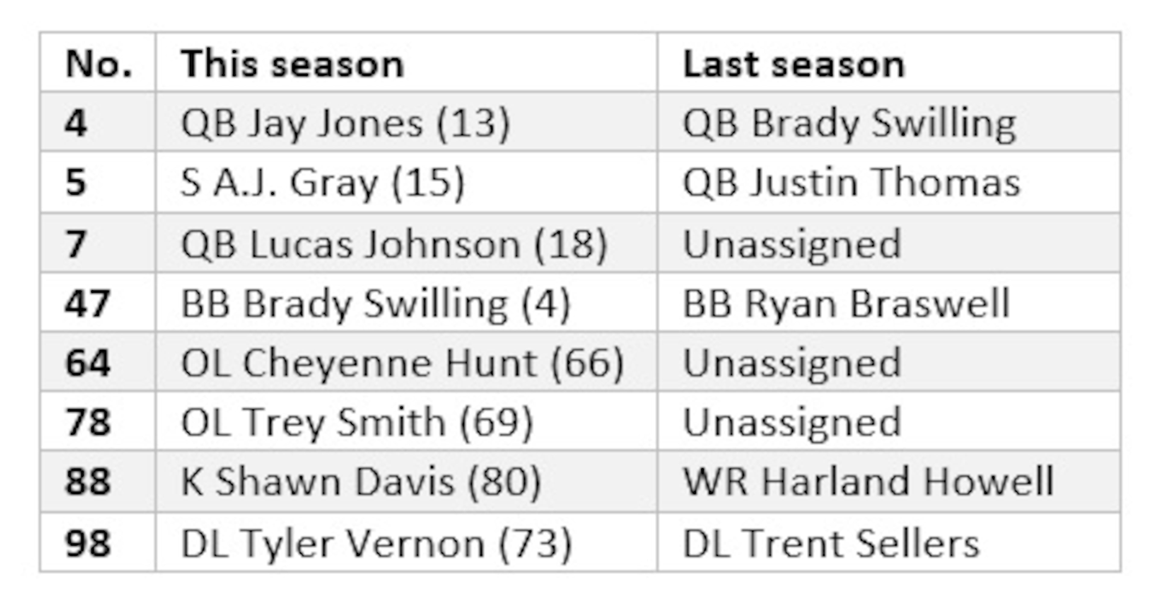 Eight players had their jersey numbers changed from last season. The most prominent is safety A.J. Gray, who swapped 15 for No. 5, worn memorably by Justin Thomas. Gray wore No. 5 at Washington County High.