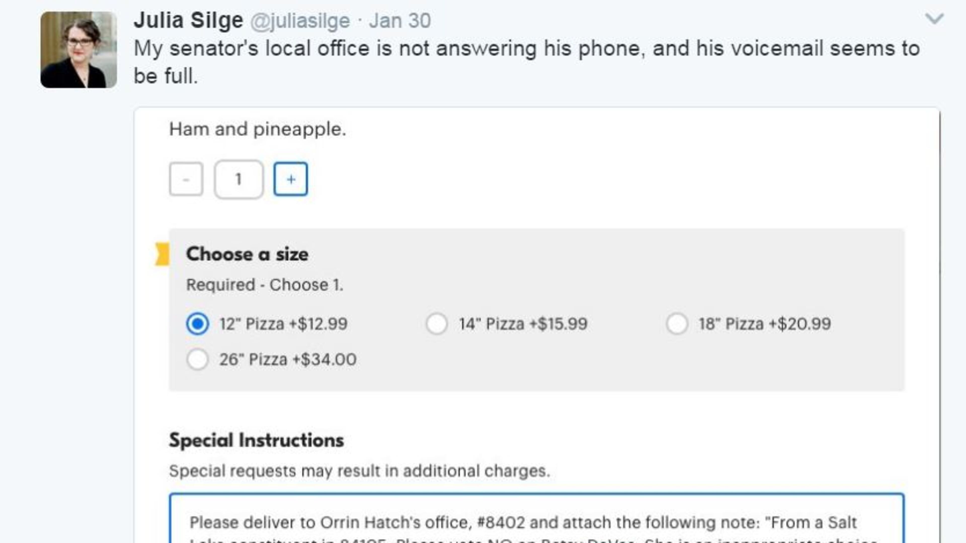 So hard that Utah resident Julia Silge resorted to ordering a pizza to be delivered to Sen. Orrin G. Hatch after she couldn't raise anyone on the phone in the Republican senator's Salt Lake City office. His voicemail was full.