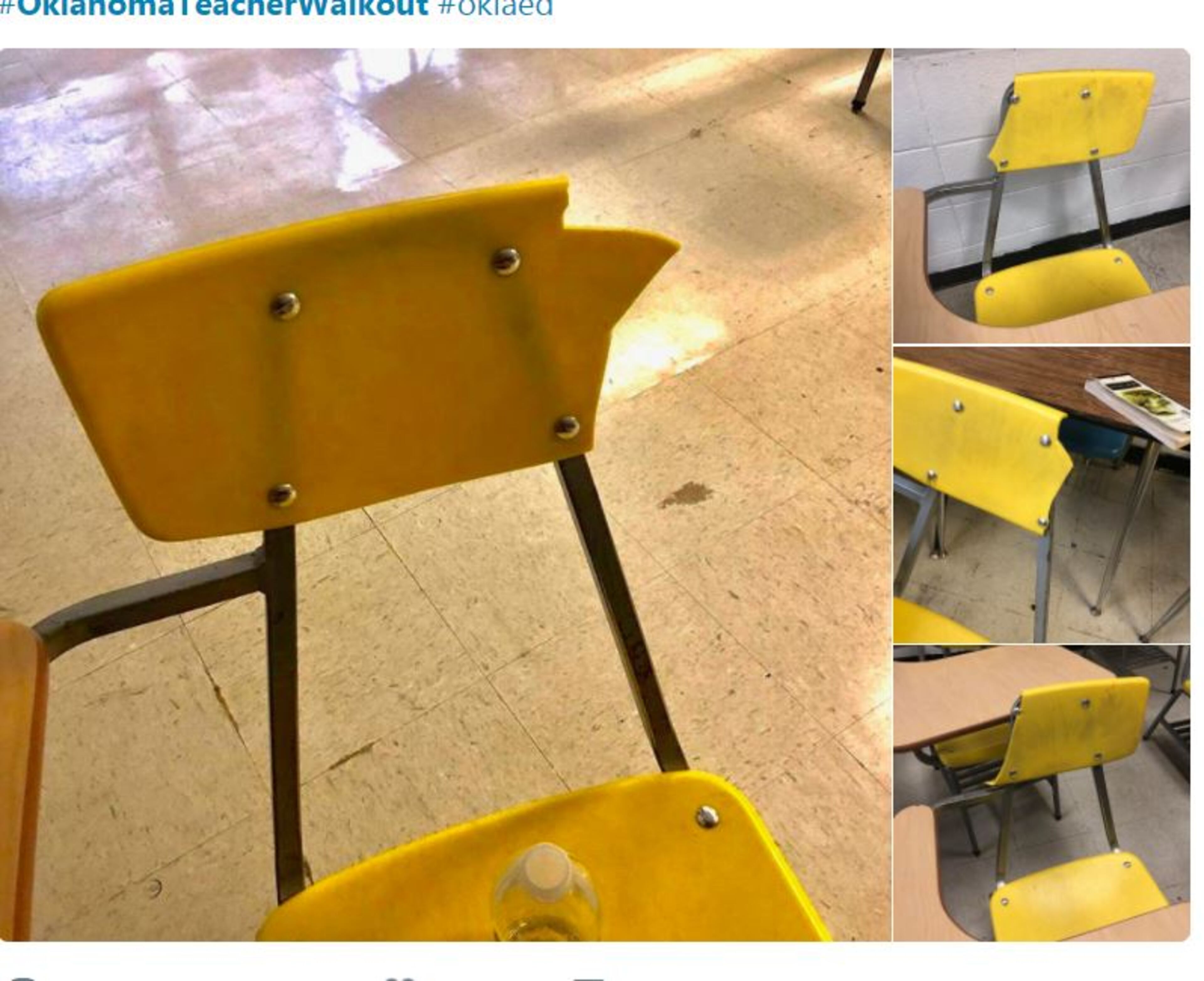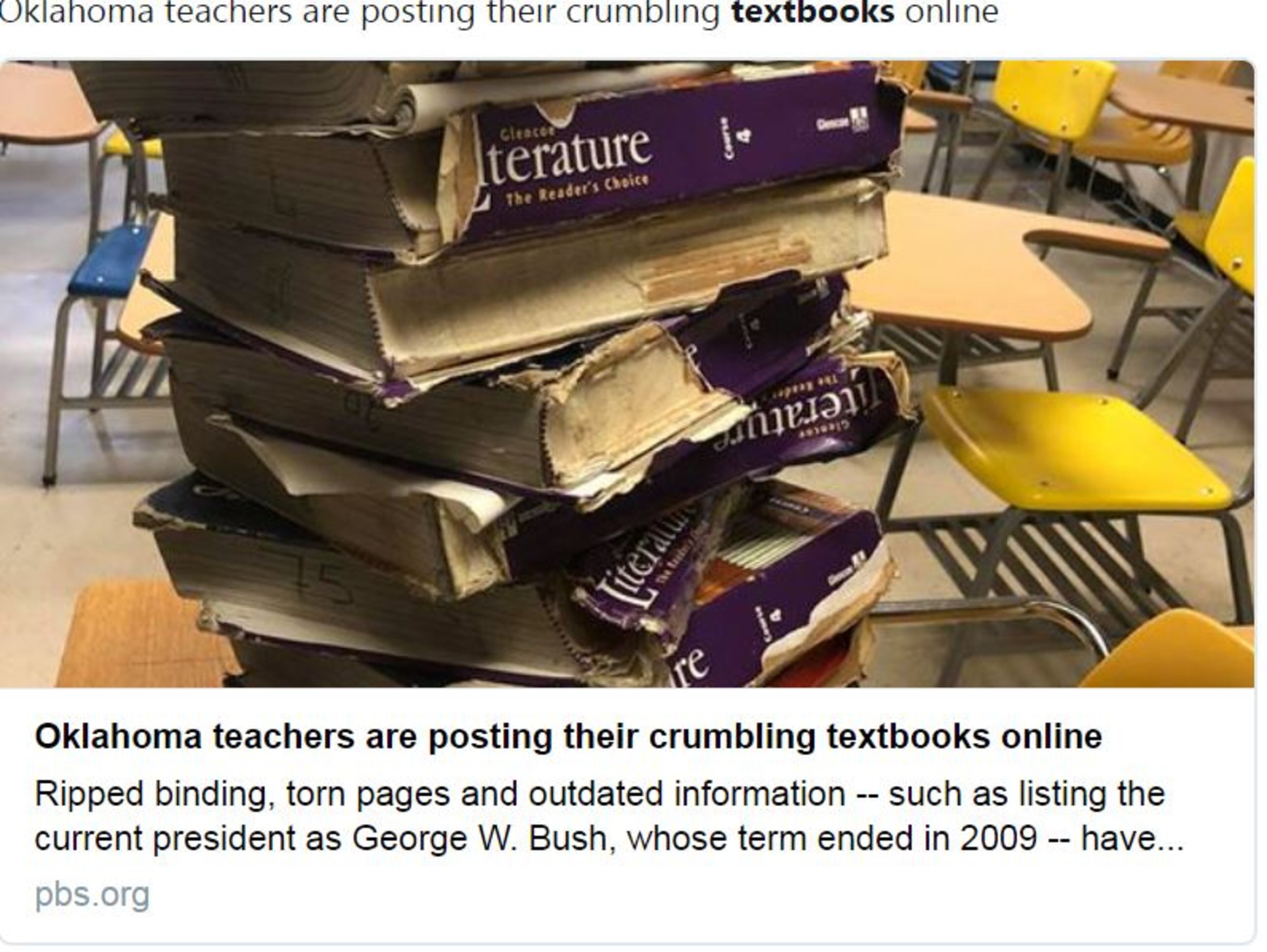 To show the effects of that lagging funding in the classroom, Oklahoma teachers and parents are tweeting photos of ragged textbooks and broken chairs.
