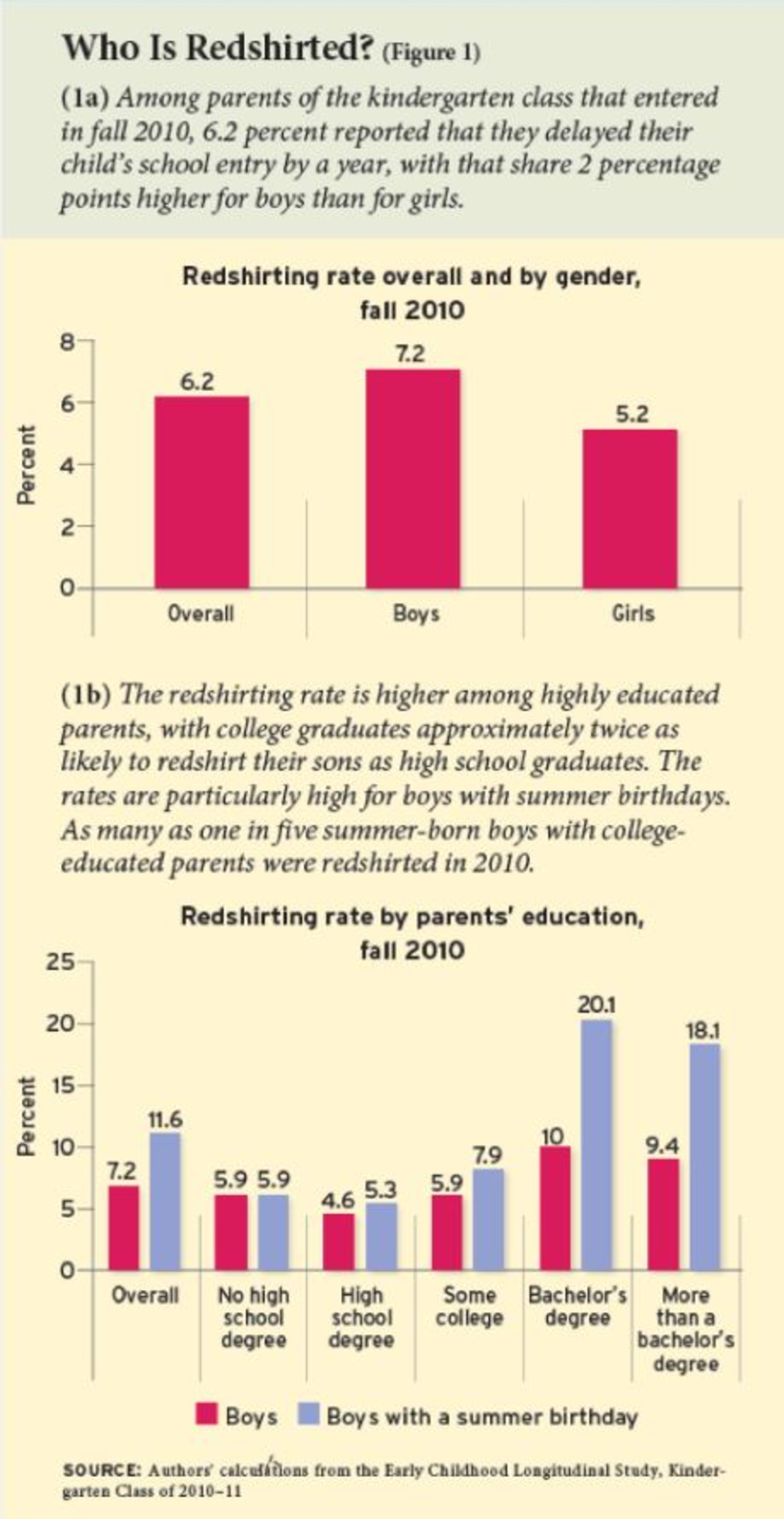 It's also more common among educated parents. When you look at boys with college-educated parents, one in five was redshirted, a rate four times that of summer-born boys with high-school educated parents. Economics may explain the disparity. When a child is redshirted, parents have to pay for another year of preschool so family income becomes a factor. Because college-educated households earn more, they're able to afford another year of preschool and may have access to higher quality preschools that make it more tempting to keep their child there.