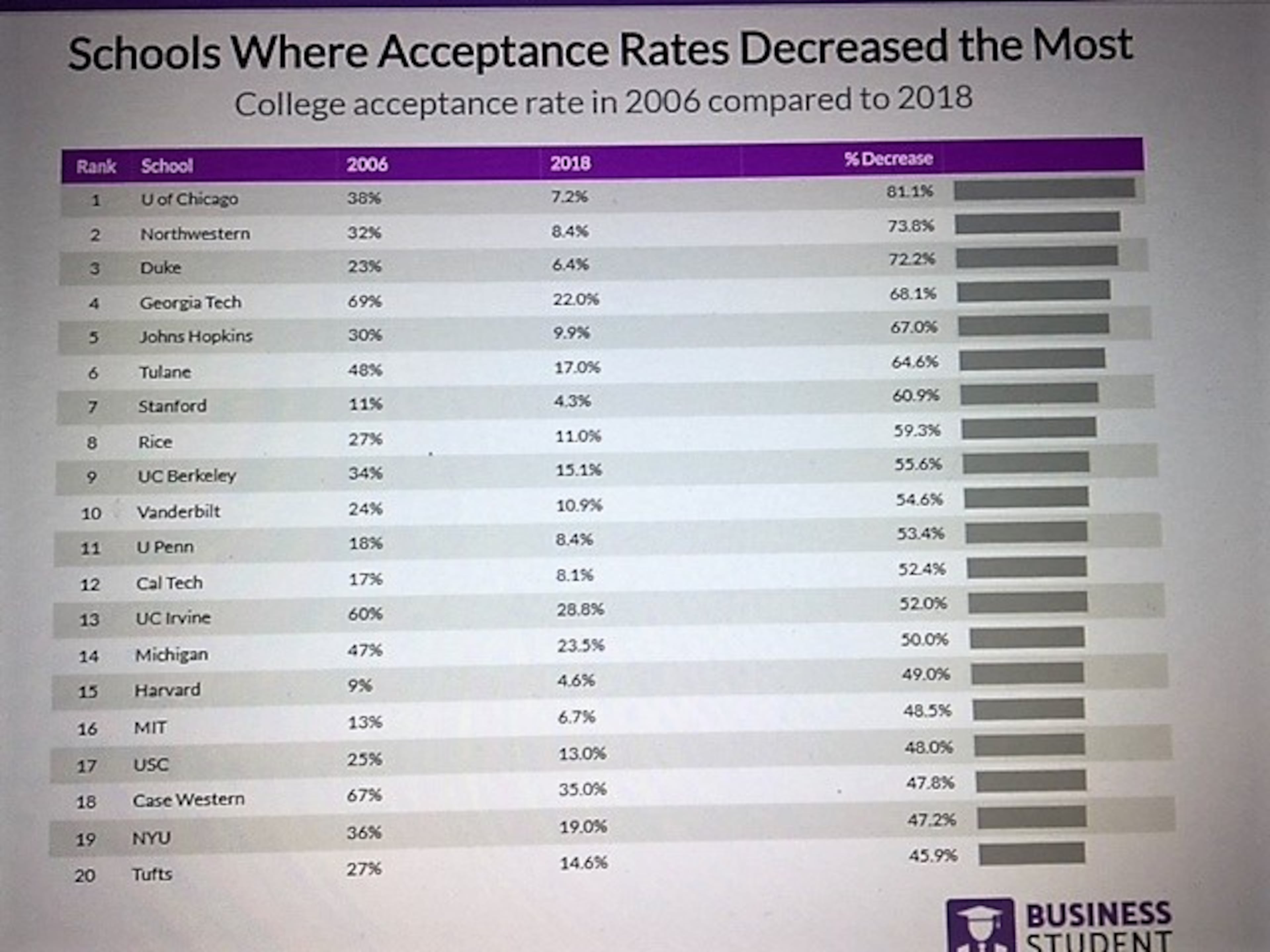 -The10 Sharpest Declines: 1) University of Chicago, 2) Northwestern, 3) Duke, 4) Georgia Tech, 5) Johns Hopkins, 6) Tulane, 7) Stanford, 8) Rice, 9) UC Berkley, 10) Vanderbilt.