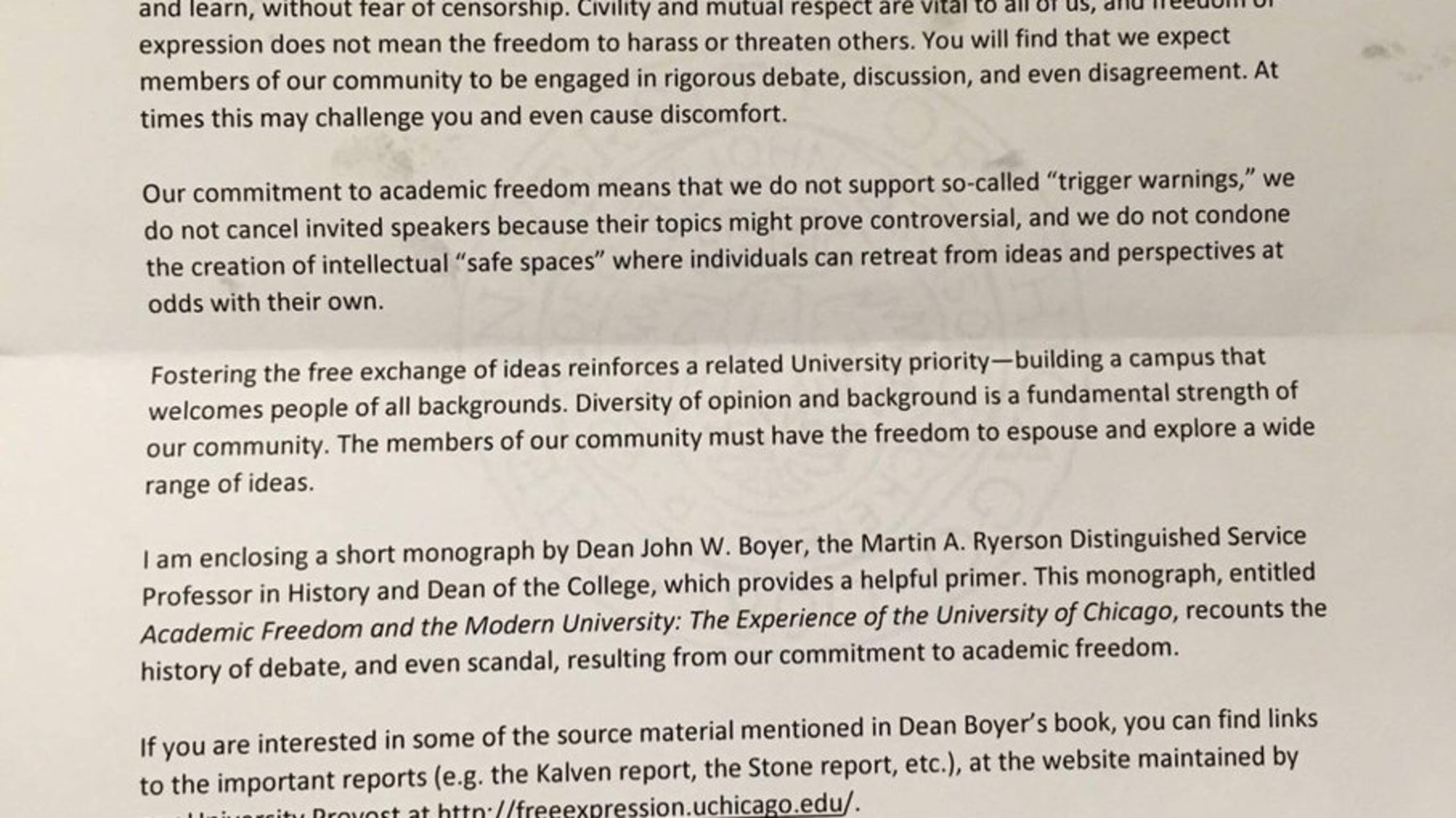 Our commitment to academic freedom means that we do not support so-called "trigger warnings," we do not cancel invited speakers because their topics might prove controversial, and we do not condone the creation of intellectual "safe spaces" where individuals can retreat from ideas and perspectives at odds with their own.