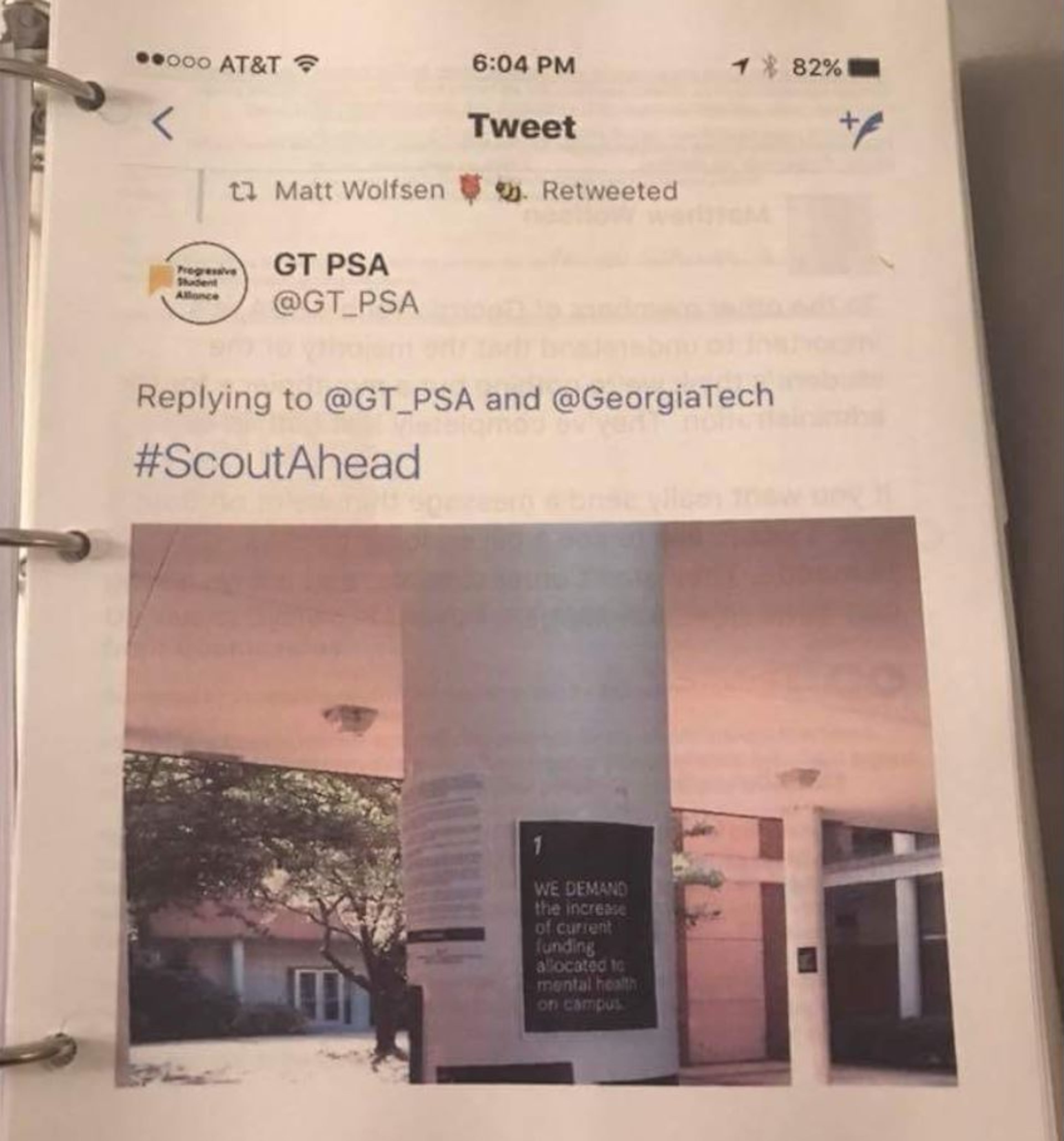 The Office of Institute Communications at Tech tracked Wolfsen's social media postings related to the issue, emailing some of the information to administrators. The scrutiny continued after the death of Scout Schultz, a fellow activist on campus. Even Wolfsen's tweet of a campus sign calling for more mental health services was recorded and passed on to the president's office.