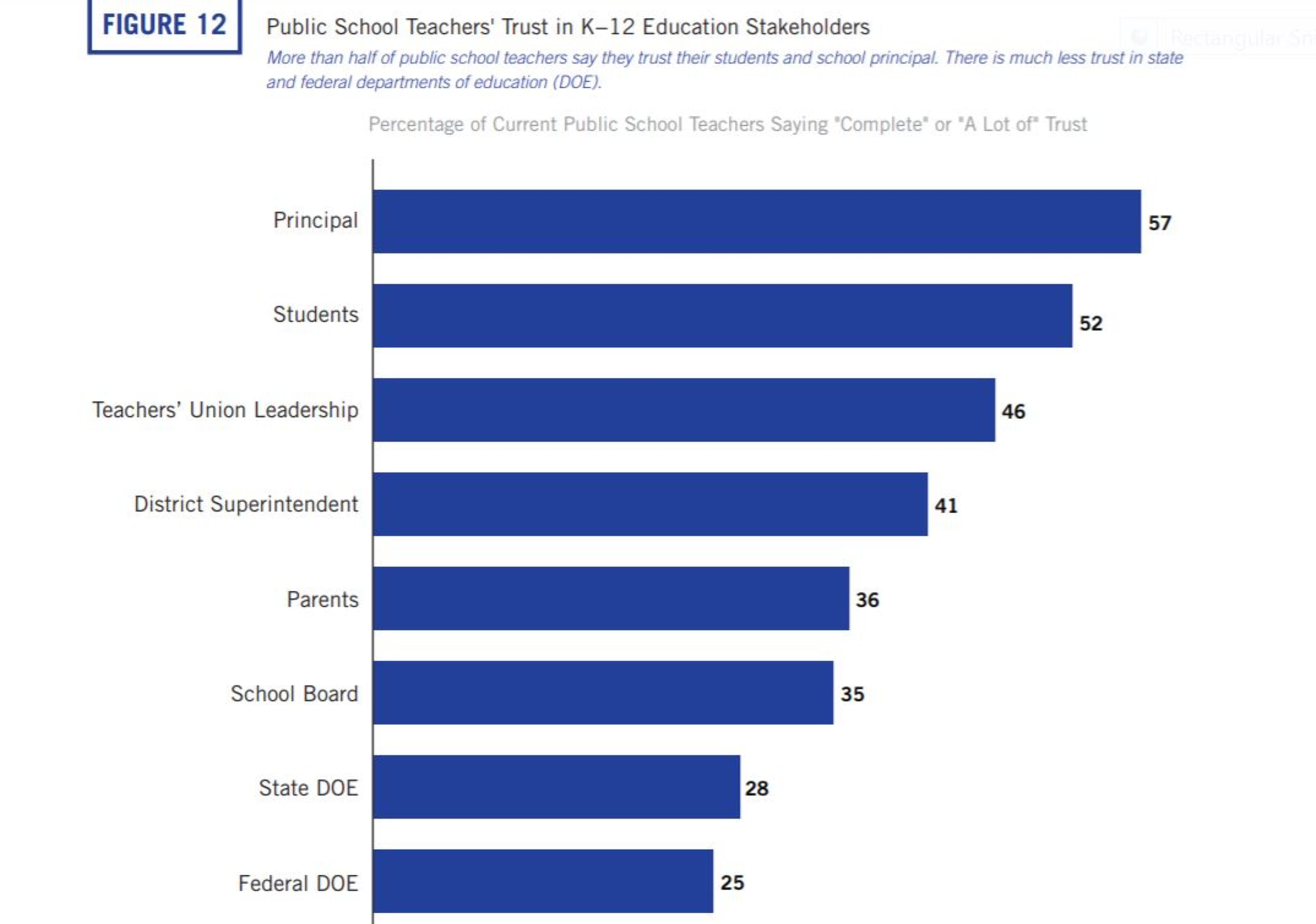 The survey asked teachers how much trust they have in the stakeholders in education. Fifty-seven percent of teachers have “complete” or “a lot of” trust in their school’s principal. The number was slightly less for students -- 52 percent. Less than half of the teachers in the survey say they trust their teachers' union leadership (46%), superintendent (41%), or their students’ parents (36%). Governing and oversight institutions garner even less trust among teachers. Roughly one-third or less of teachers signal trust in their school board (35%), state department of education (28%), or the federal department of education (25%).