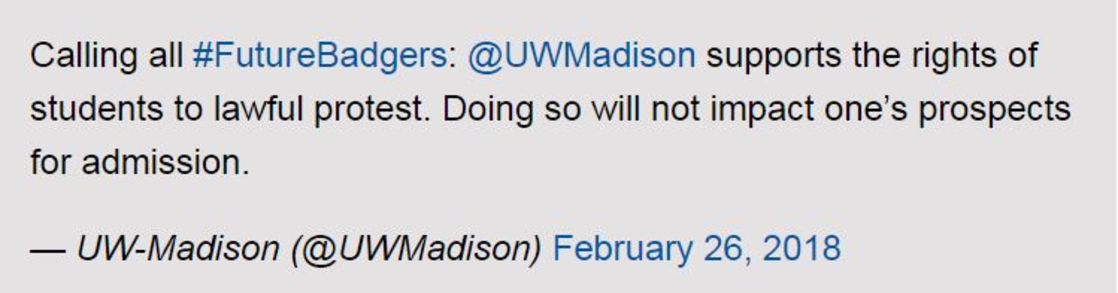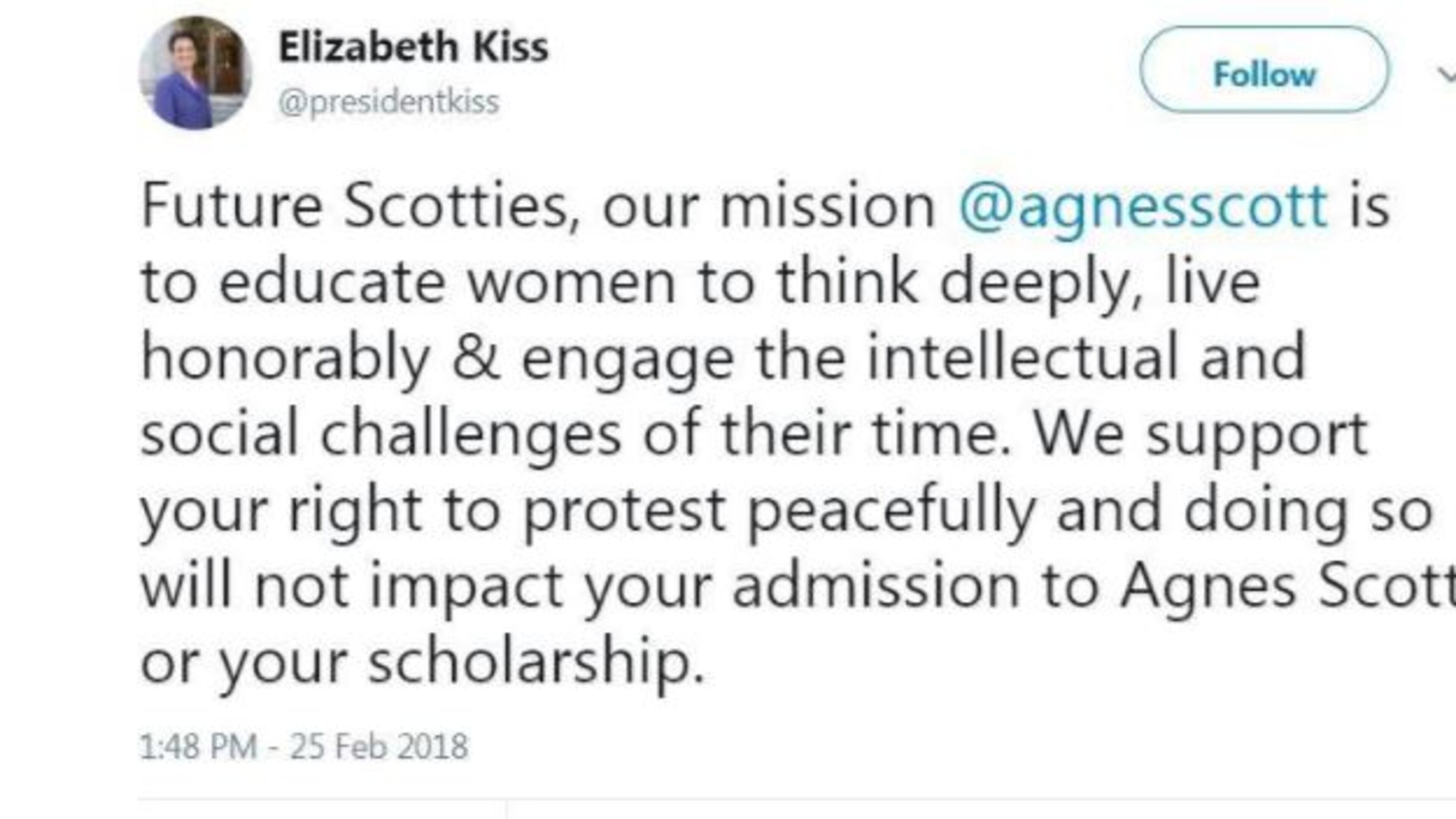 As a parent of a student who plans to participate in the walkout told me: “What's curious to me is that she has heard from all of the schools that she's applied to that they respect students' decision to engage in peaceful protest and they will not rescind the offer of admission to students (or cause it to factor into a pending admission decision) because they engage in peaceful protest with two exceptions --UGA and Georgia Tech.’’