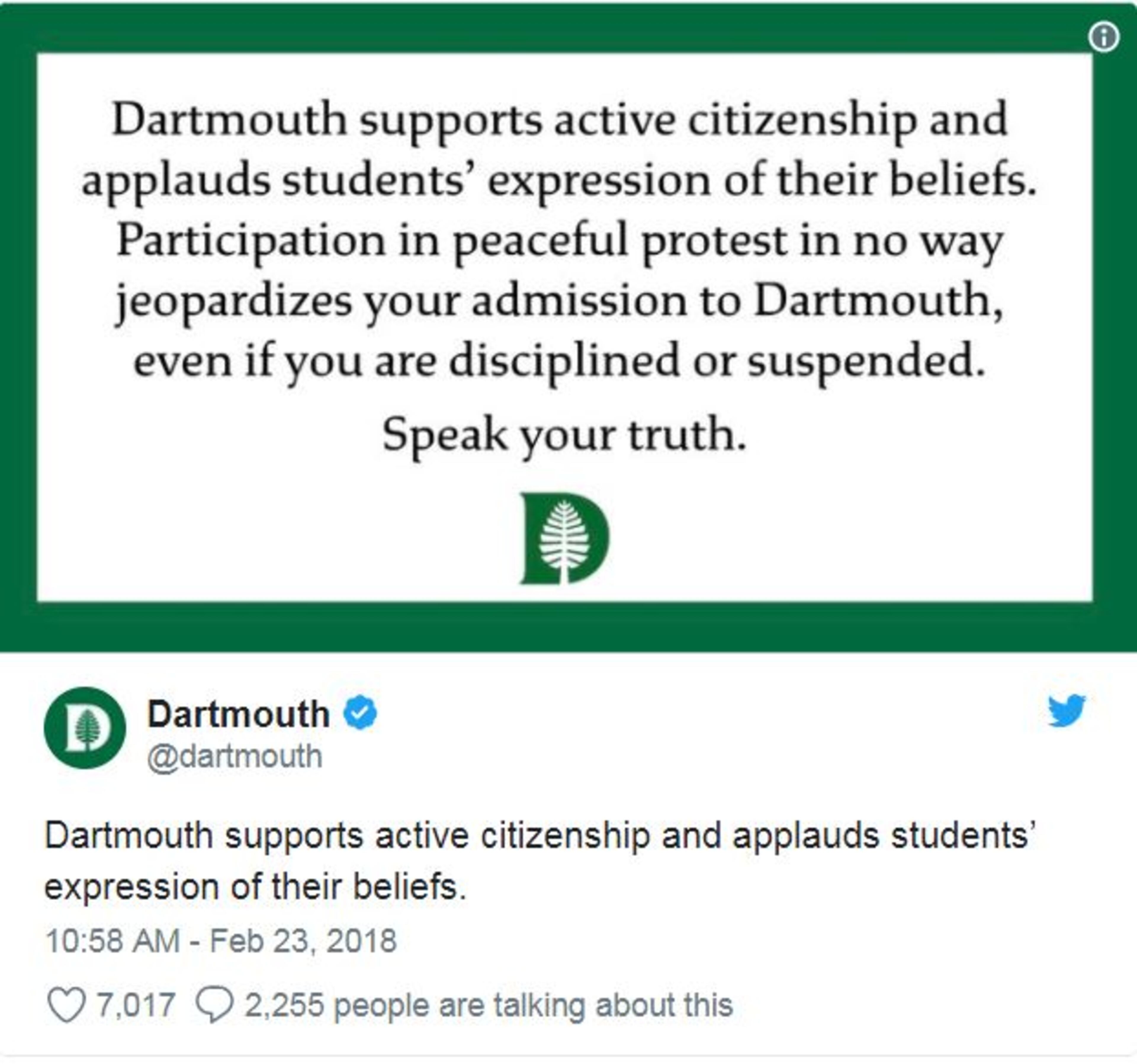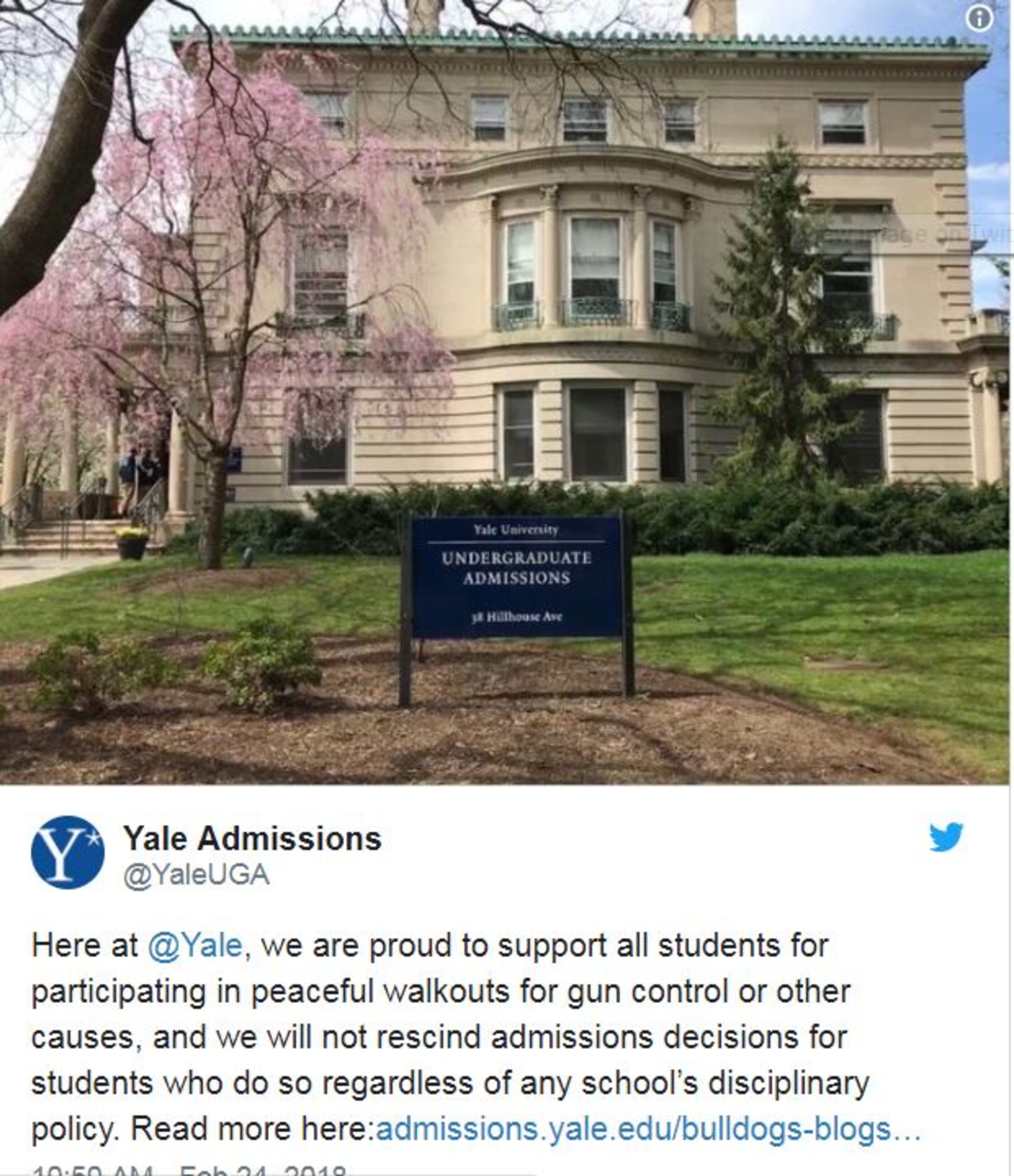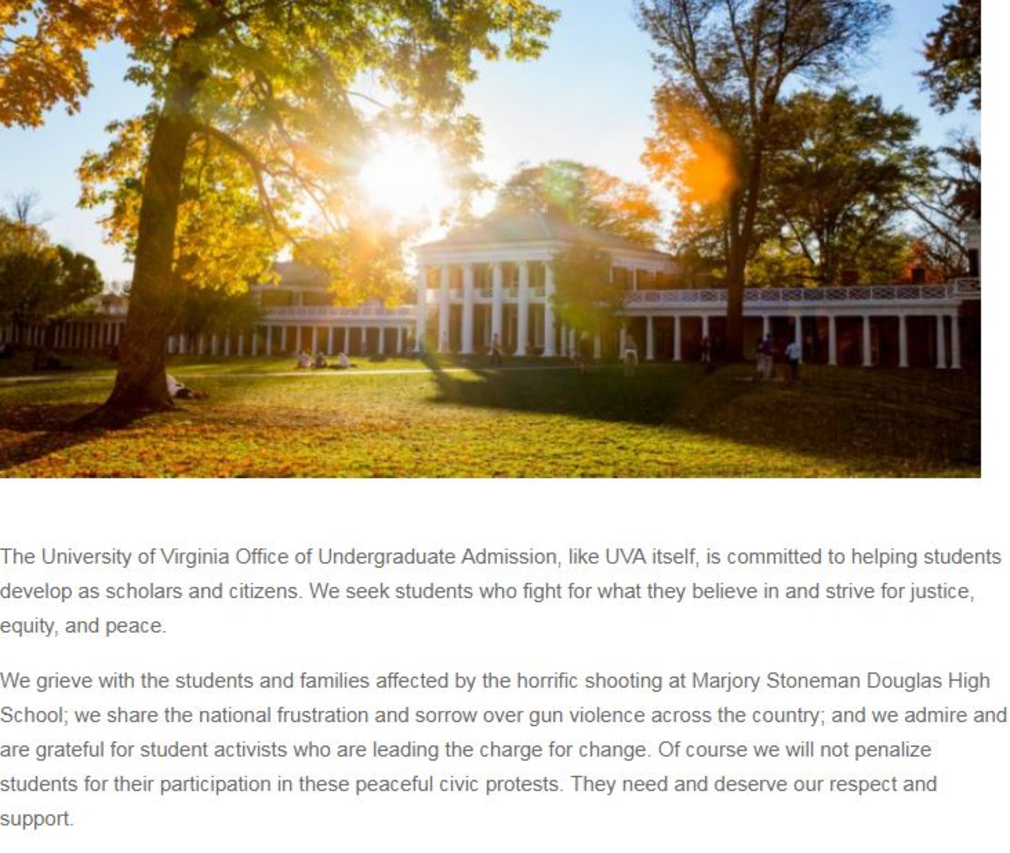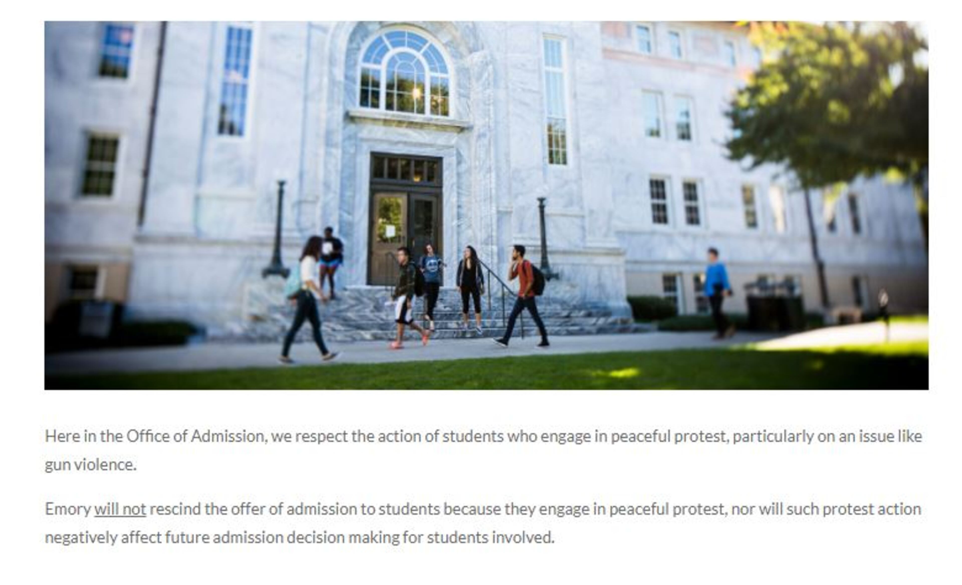 More than 300 colleges, including Emory, Agnes Scott, Duke, Yale, MIT, and the University of Virginia, have assured applicants they respect their social activism and will not penalize them for any disciplinary actions that may result from participating in the walkout. (Colleges require students to notify them of any disciplinary actions and the schools retain the right to rescind an admission offer.)