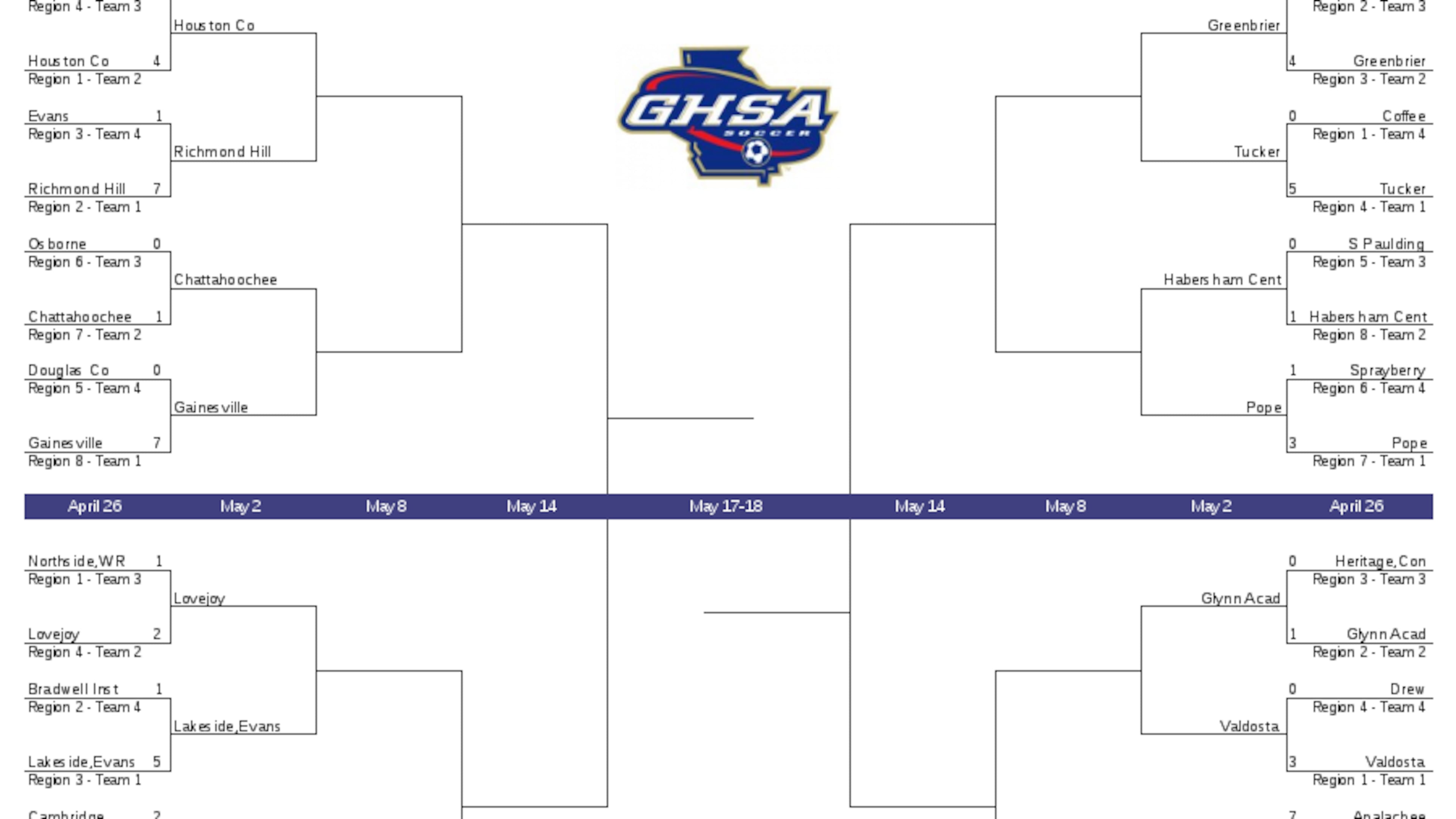 Gainesville defeated Douglas County 7-0 in the first round. The victory was highlighted by a hat-trick from Pedro Santos and goals from Erik Sica, Lara Aram and Jose Aguilera. Gainesville has two titles – a AA/A title in 1998 and a AAA title in 2010.