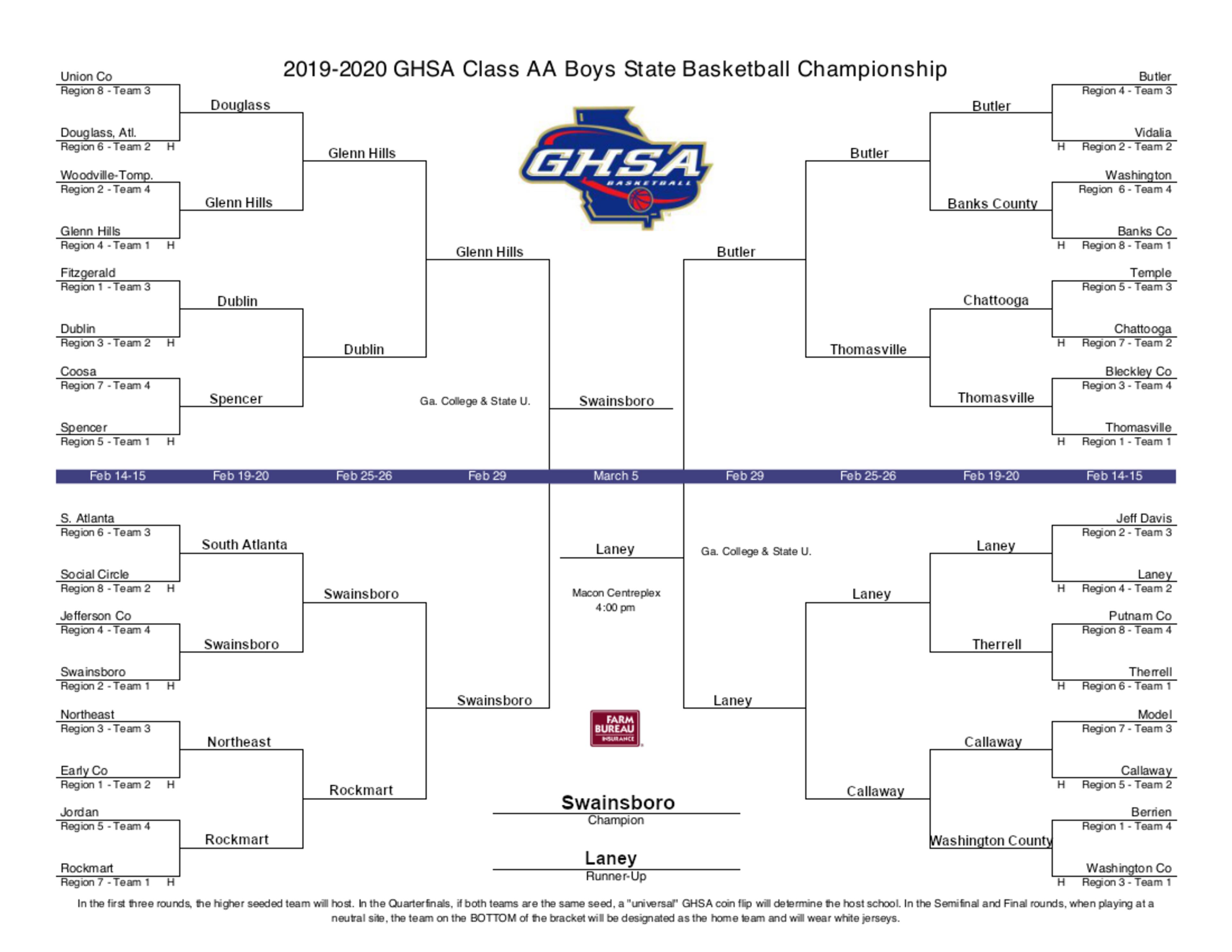 Tournament action begins on Friday, with the higher seed hosting through the first three rounds. In the quarterfinals, if both teams are the same seed, a universal coin toss will be administered by the GHSA to determine the host school. Georgia College and State University in Milledgeville will host the semifinals on Feb. 29.