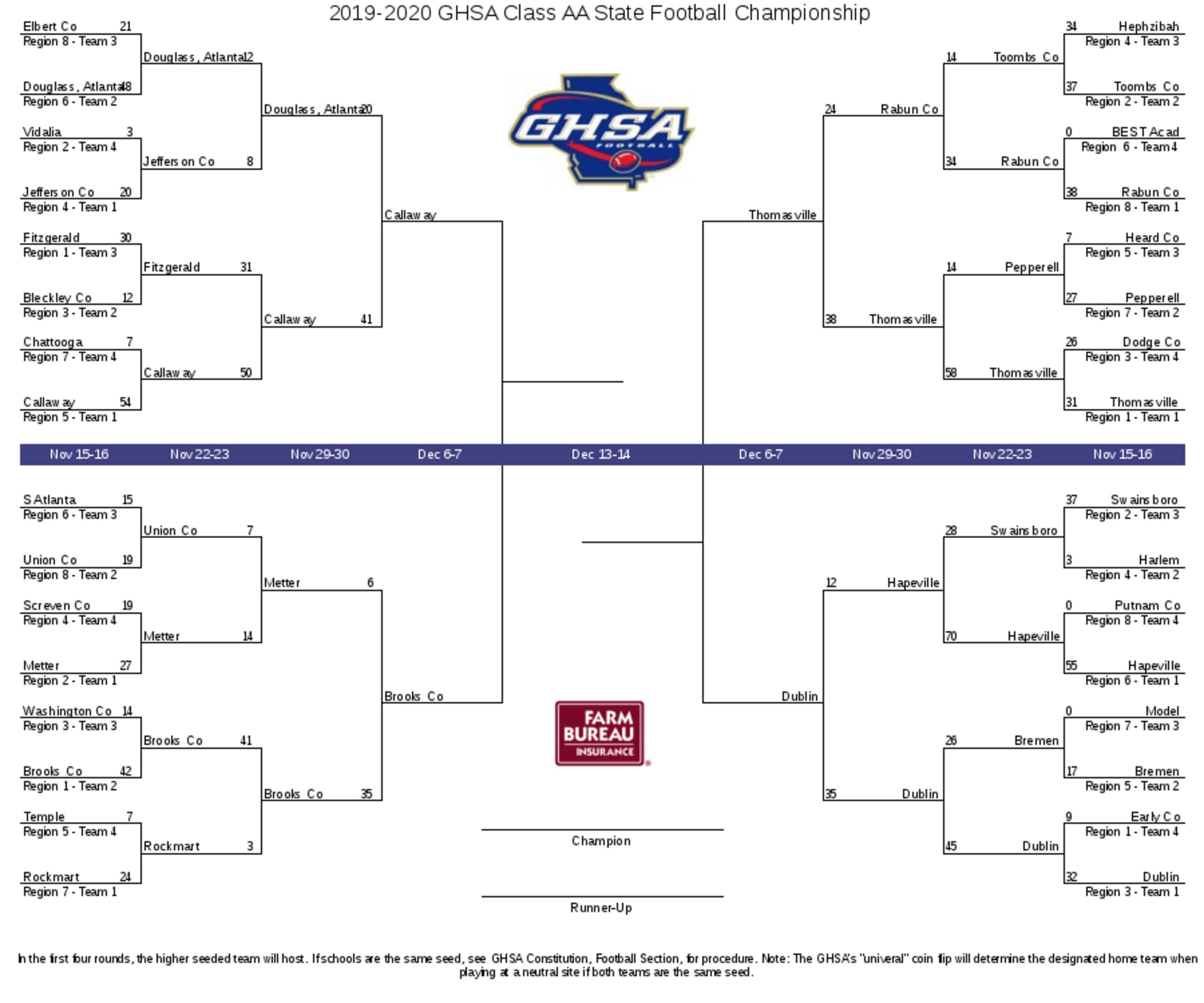 We’re down to four and next week, Callaway will host Brooks County and Thomasville will host Dublin as the teams fight for their place in the GHSA AA state championship game, which will take place 1 p.m. Friday, Dec. 13 at Georgia State Stadium.
