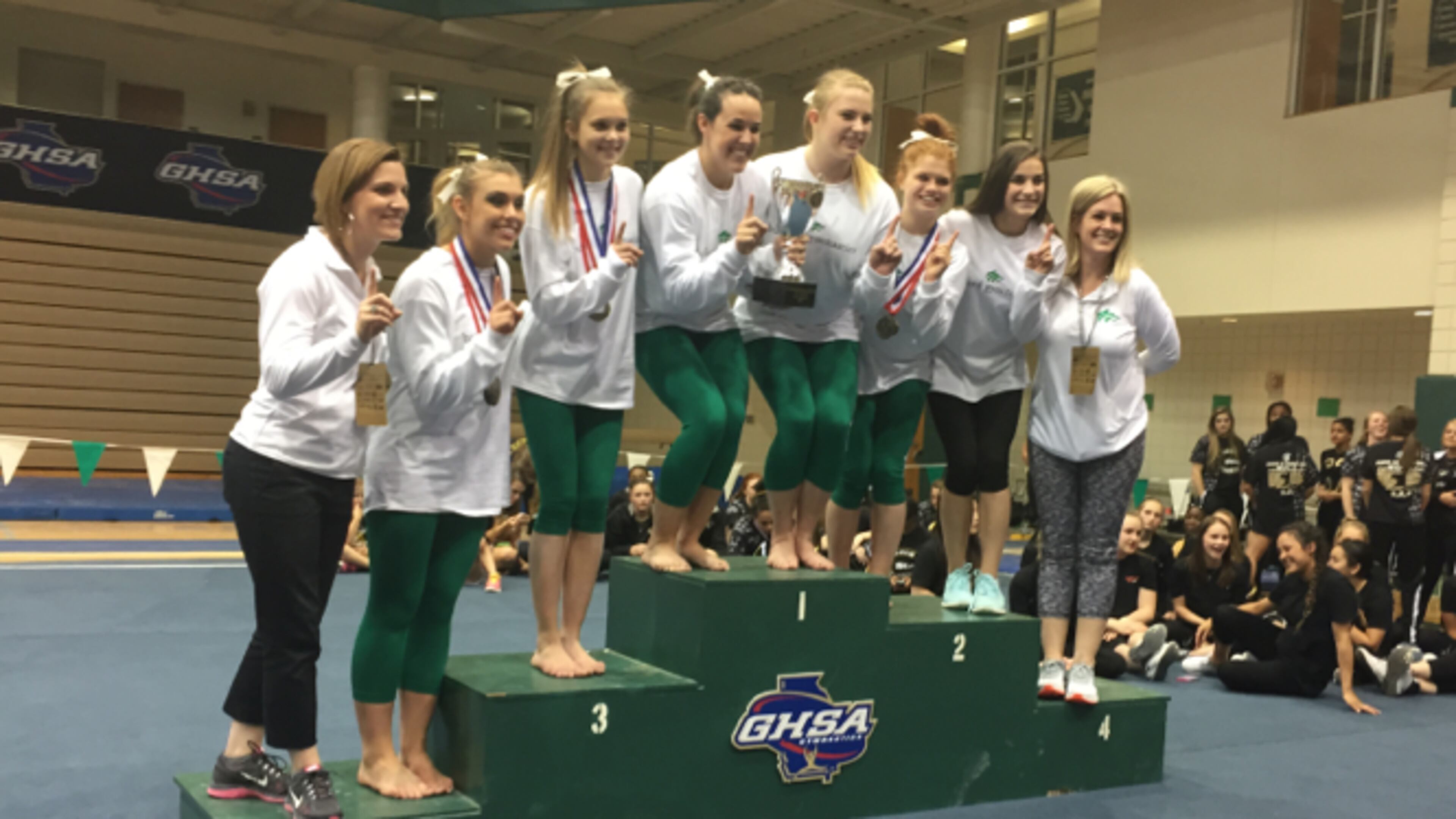 Buford won its second consecutive GHSA gymnastics state championship in convincing fashion with a score of 111.425 Friday night at Westminster’s Turner Gym. Carrollton finished second with a 107.725 and Lambert edged Forsyth Central 104.375 to 104.050 for third place.