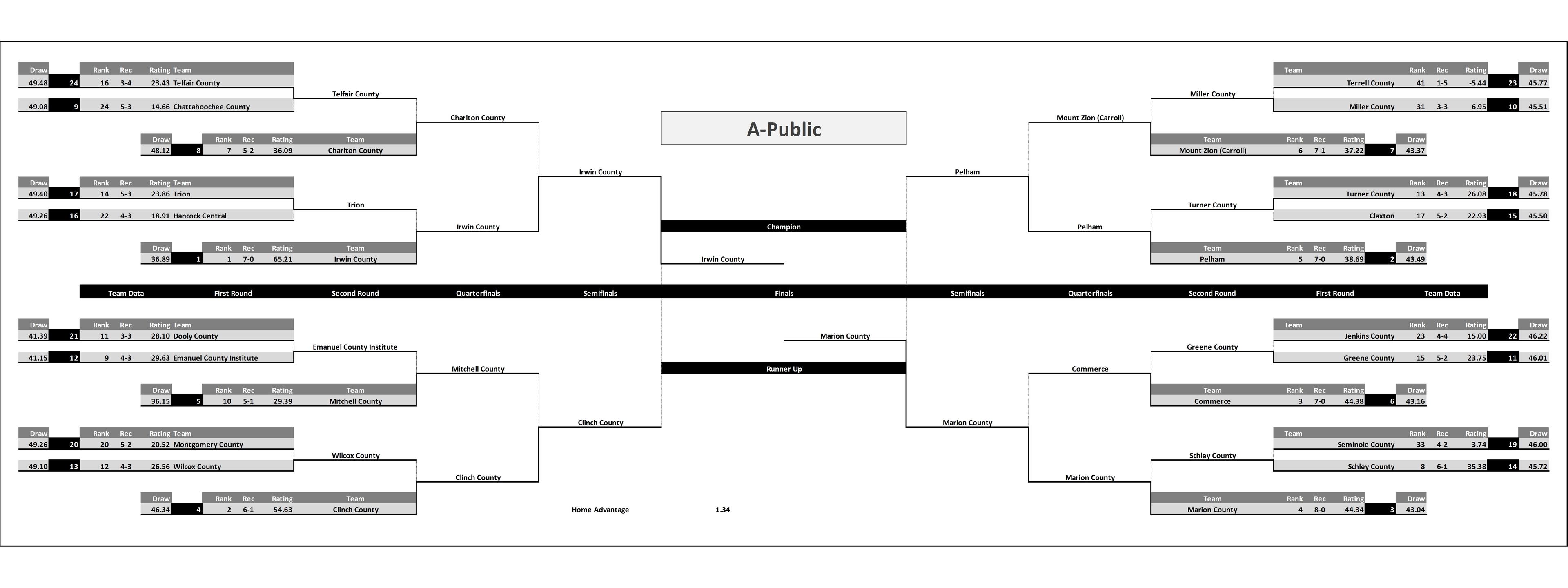 Although regions may use different criteria, in the simulation all standings were determined by 1) region record, 2) head to head, 3) point differential, 4) classification record, and 5) random tie breaker.