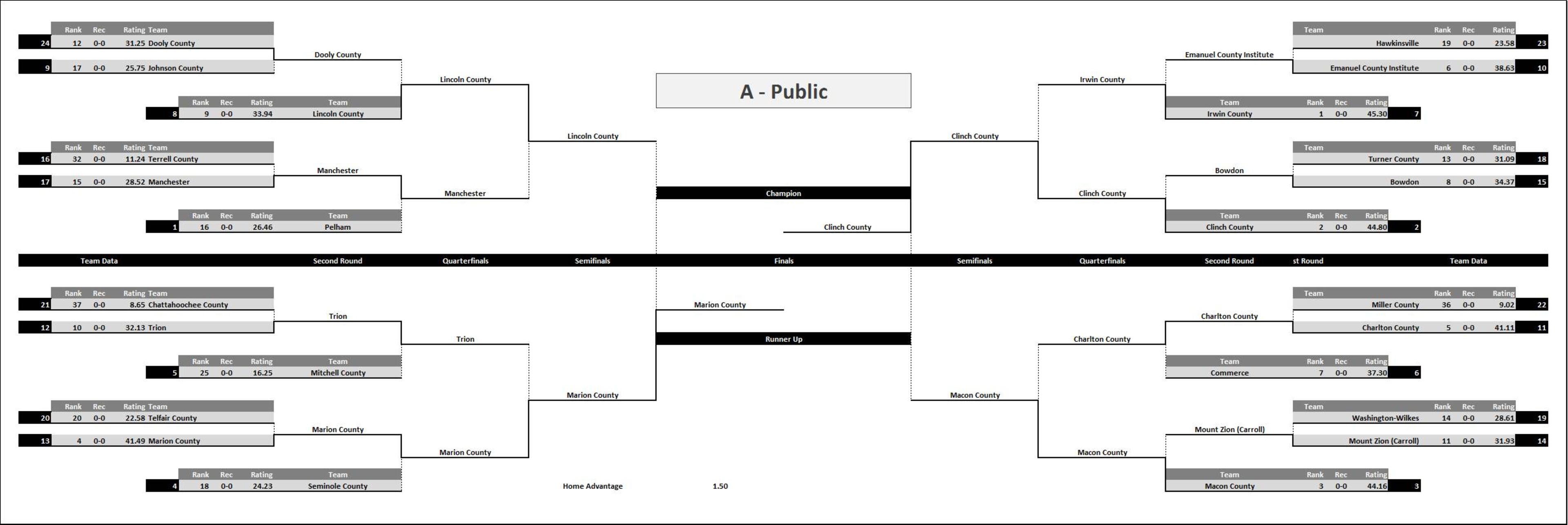 | Schley County | 4 - A | 0-0 | -7.88 | 2 | - | - | - | - | - |